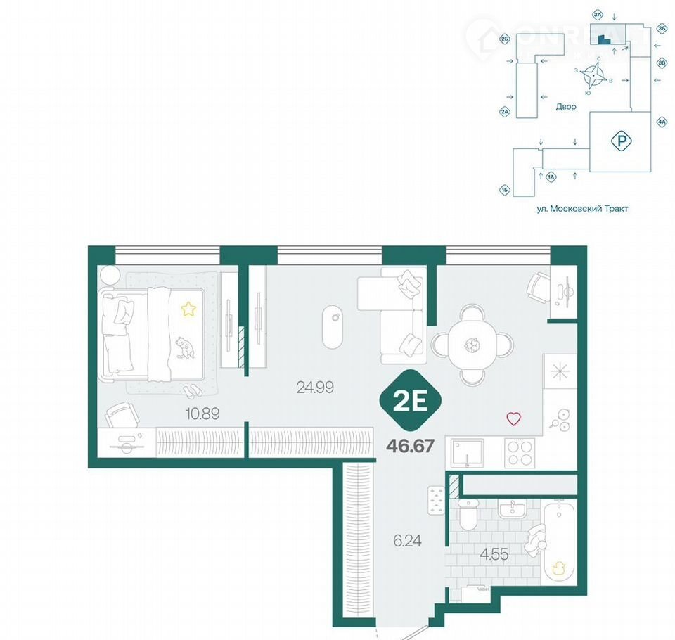 Однокомнатная квартира евроформата с зонированной кухней и гостиной, большой ванной комнатой. В прихожей есть ниша под встроенный шкаф.