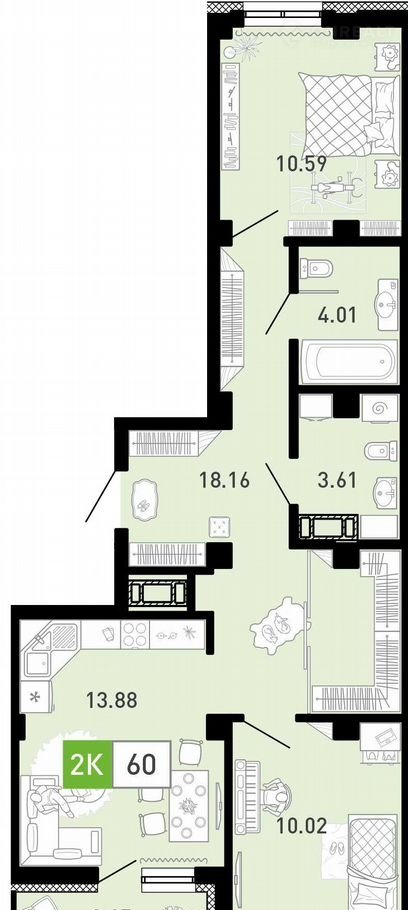 Общая площадь 60.7 м2