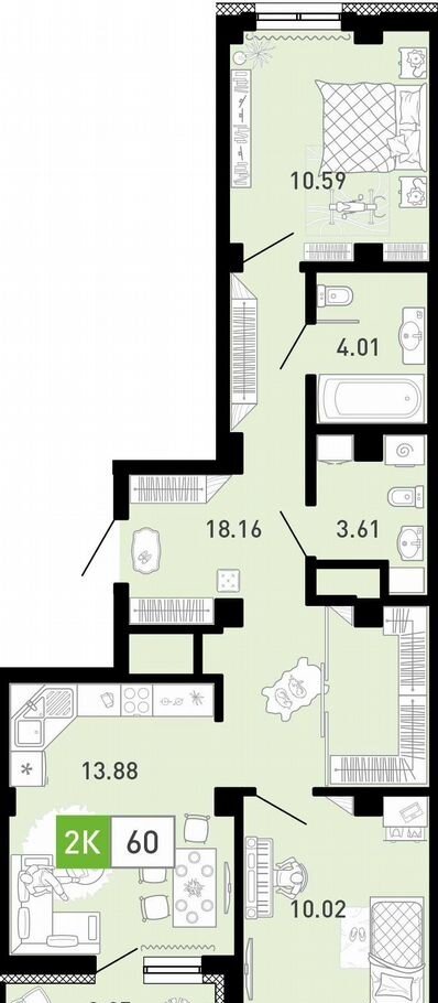 Общая площадь 60.3 м2