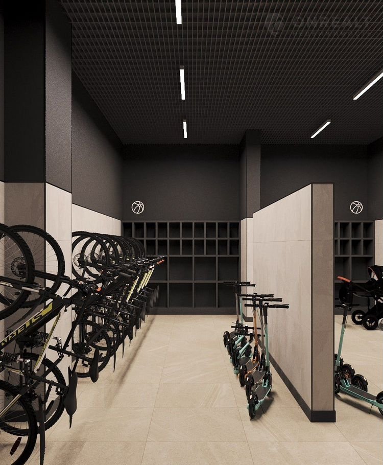 · Холлы с зонами ожидания, теплым тамбуром, колясочными и велосипедными с зарядками для электросамокатов