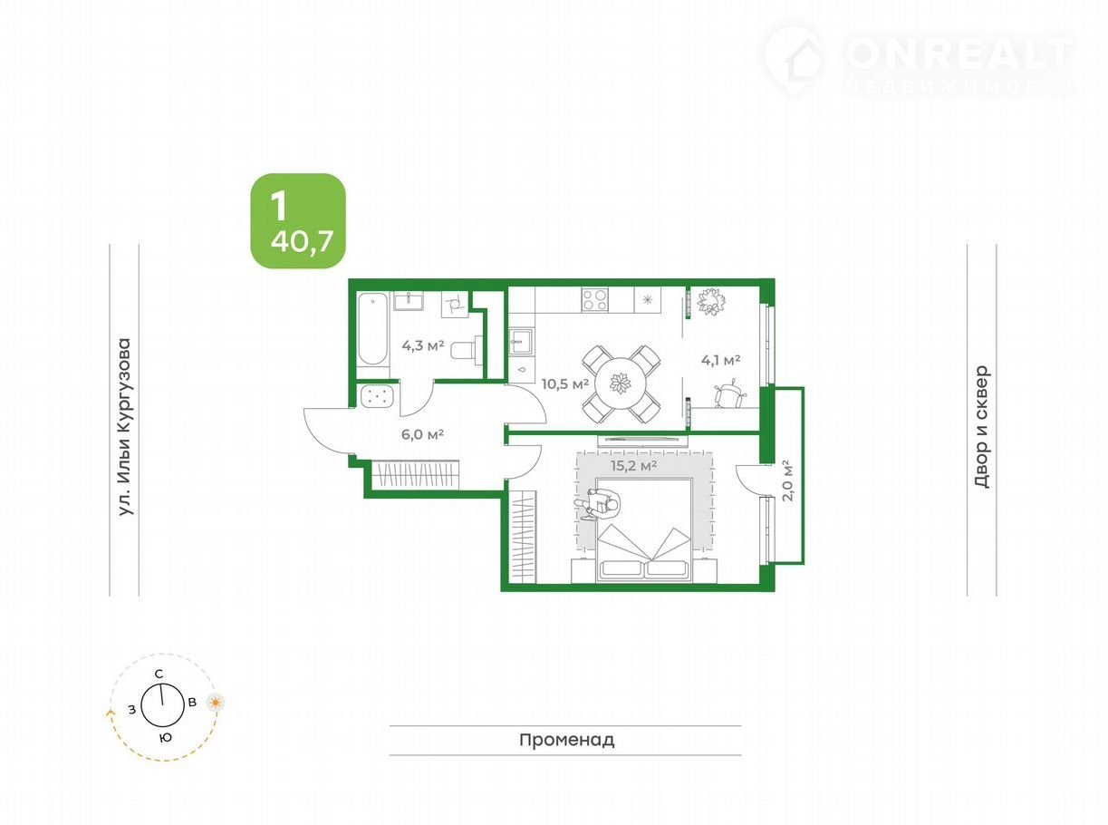 Общая площадь 40.7 м2