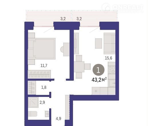 Общая площадь 43.2 м2