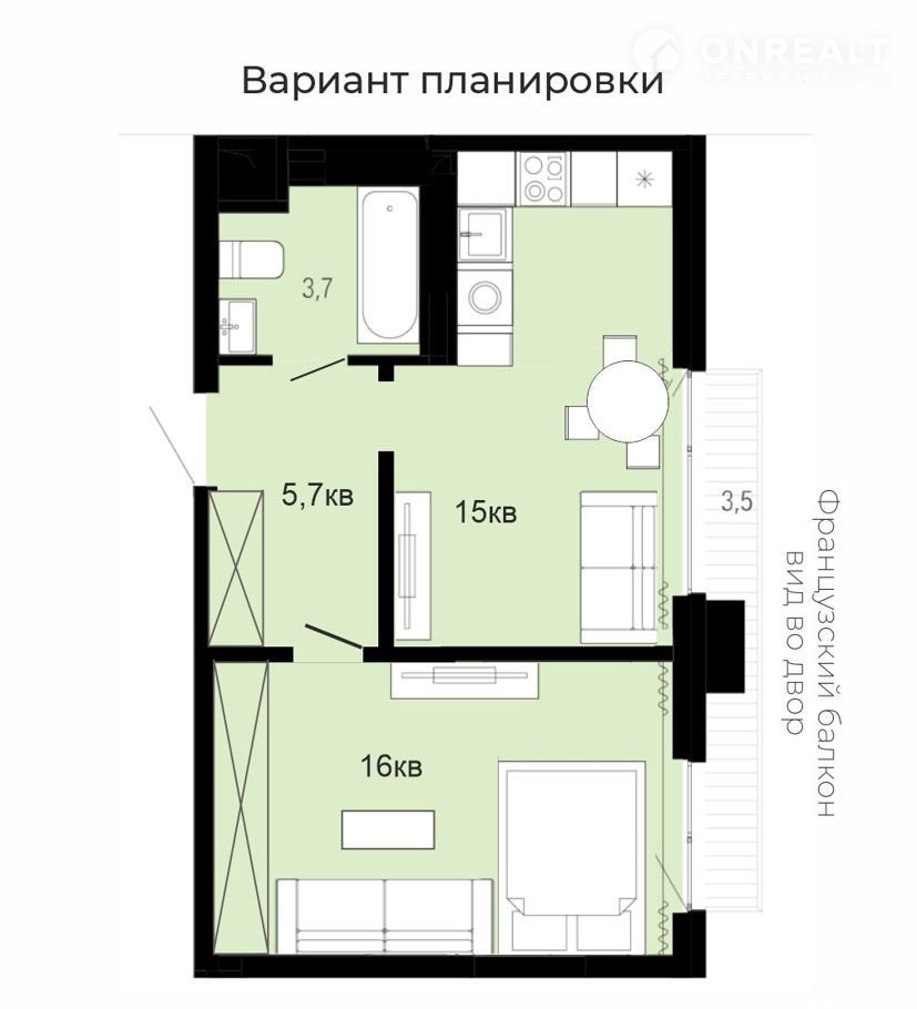 На 3д-визуализациях изображена эта планировка, отрисованная по плану.