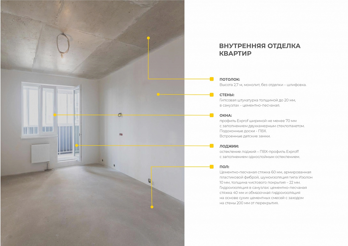 Отделка квартир: улучшенная черновая штукатурка стен; ПВХ-окна с тройным стеклопакетом, остекление лоджий; высота потолков - 2,7 м; стальные радиаторы «Purmo», «Buderus»; монолитно-каркасная сейсмически устойчивая технология строительства дома; трехслойная кладка стен с теплоизоляцией; горизонтальная разводка труб отопления; выравнивающая песчано-цементная стяжка полов с теплозащитным слоем.