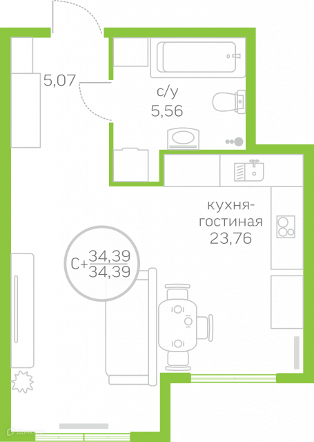 Общая площадь 34.5 м2