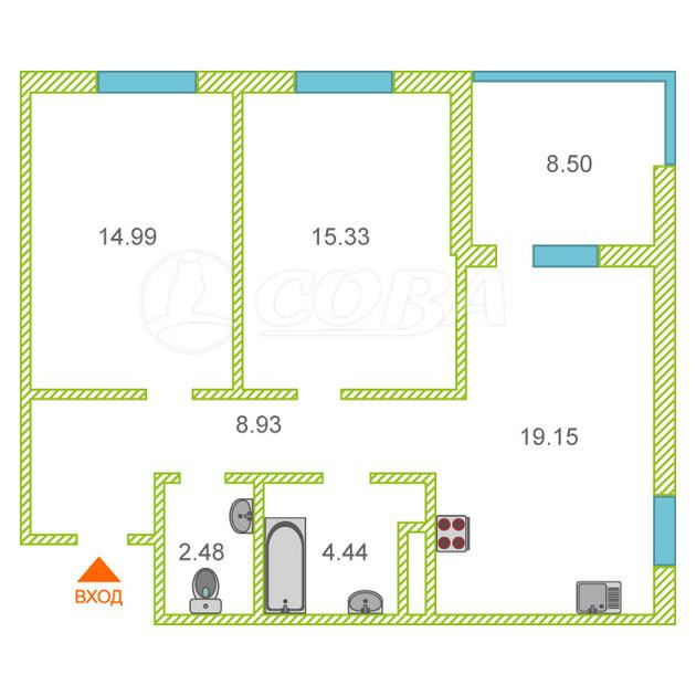 3-комнатная квартира, 72 м2, этаж 8 / 12, на продажу в Тюмени
