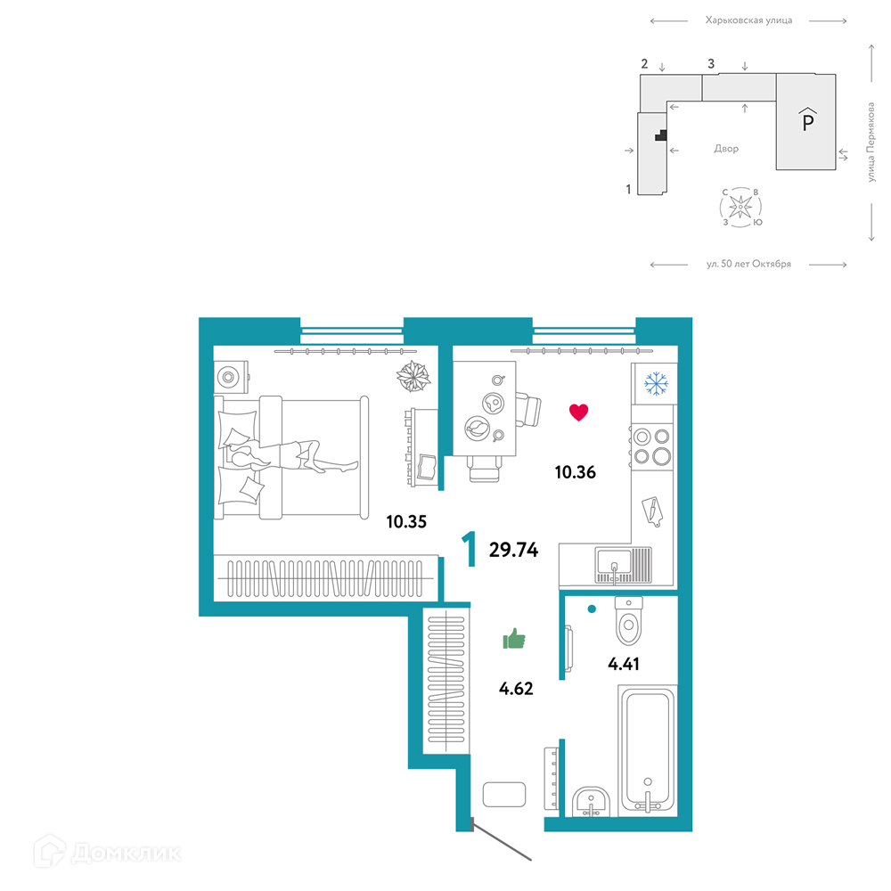 1-комнатная квартира, 29.1 м2, этаж 10 / 13, на продажу в Тюмени, Харьковская улица, 76
