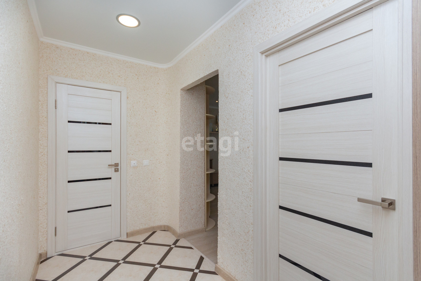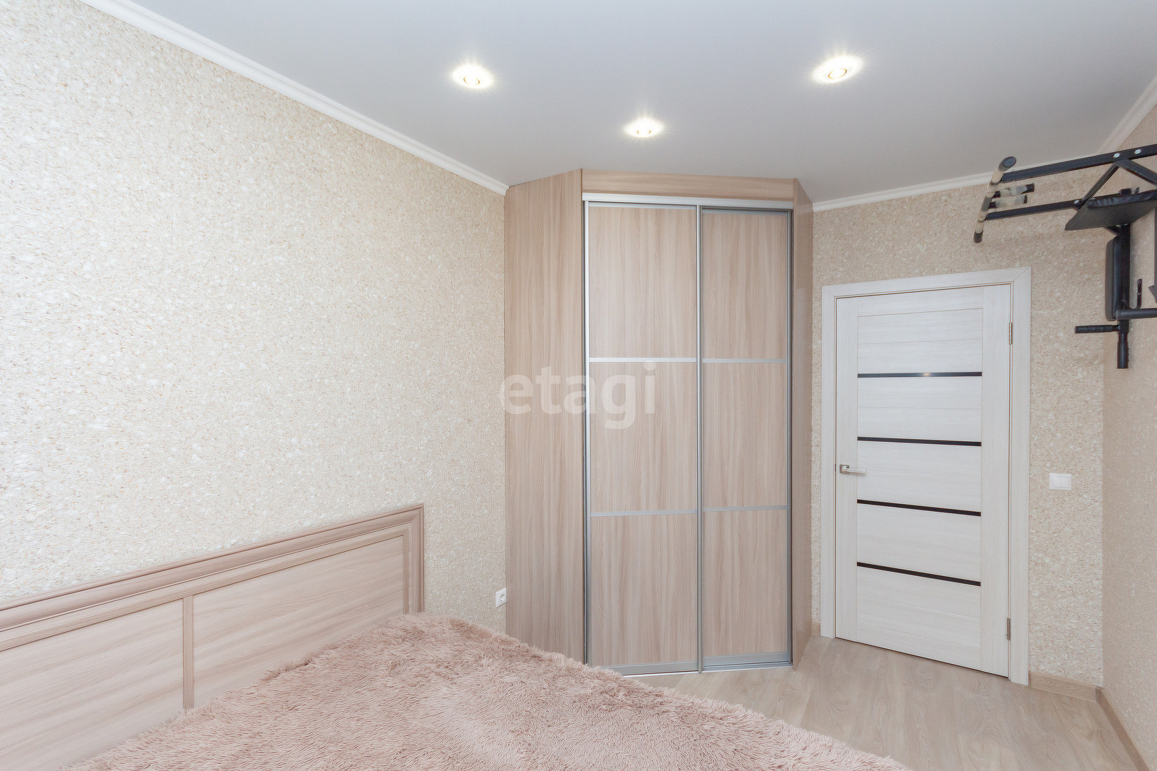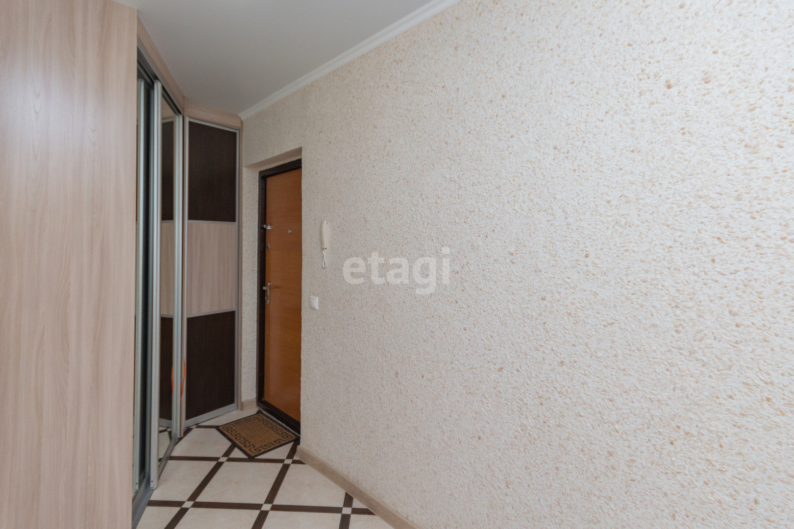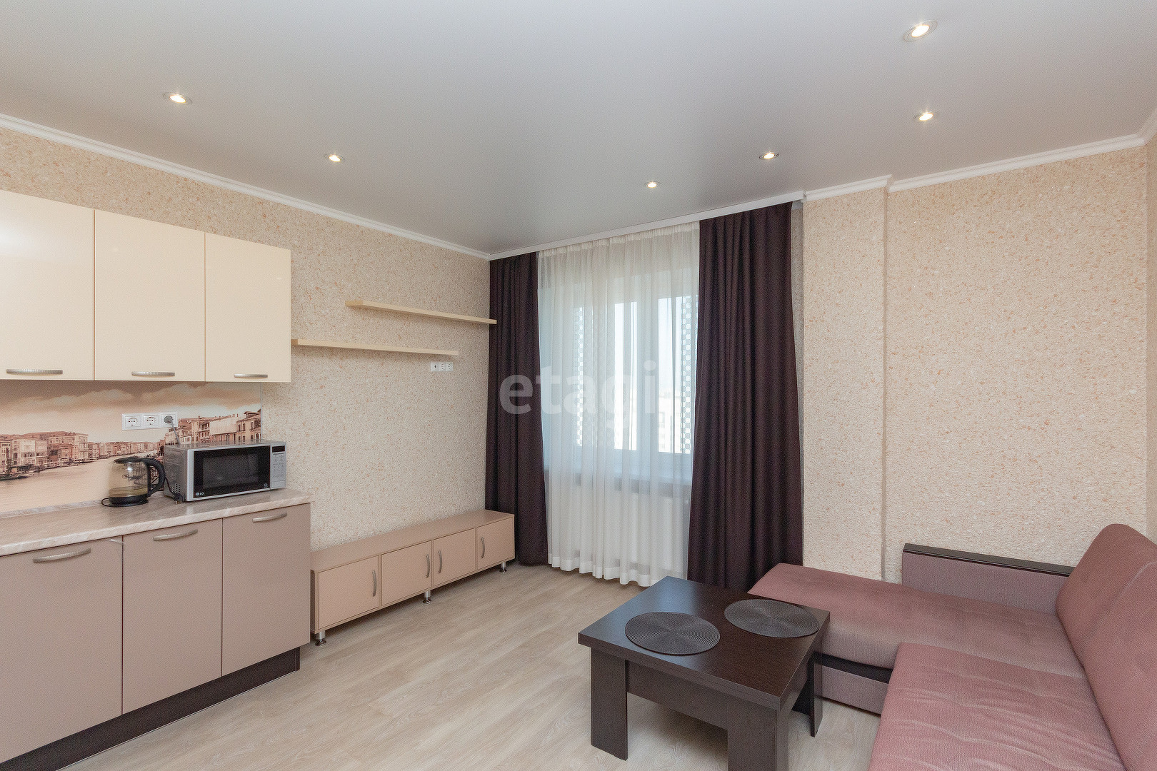 У квартиры удобная планировка, в 39 квадратах разместились большая кухня-гостиная, комната, гардеробная и совмещенный санузел. Лоджия (в площадь квартиры не входит). При этом кухня имеет квадратную форму, что позволяет разделить ее на зону готовки, обеденную группу и зону отдыха. Ремонт аккуратный, в приятных цветовых тонах, на полу ламинат.