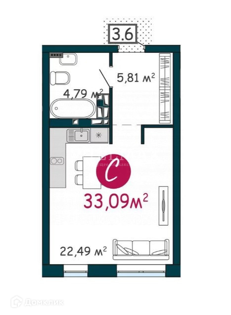 Общая площадь 33.09 м2