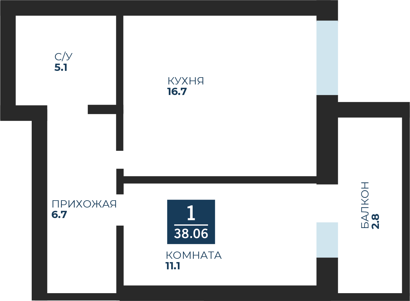 Общая площадь 38.7 м2