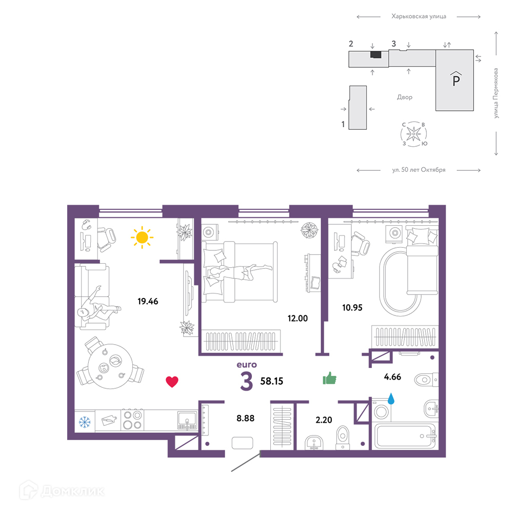 Общая площадь 58 м2