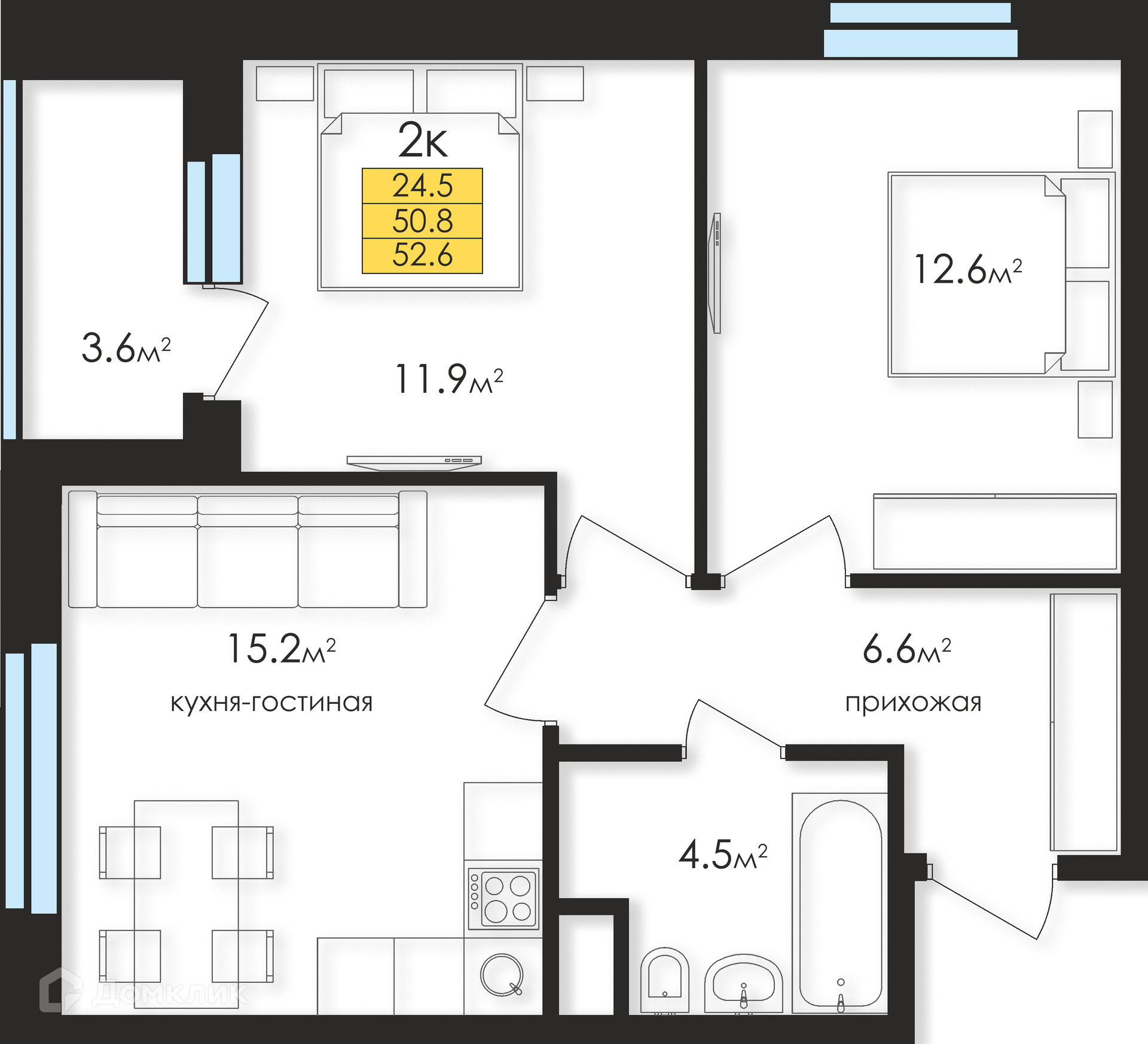 Общая площадь 52 м2