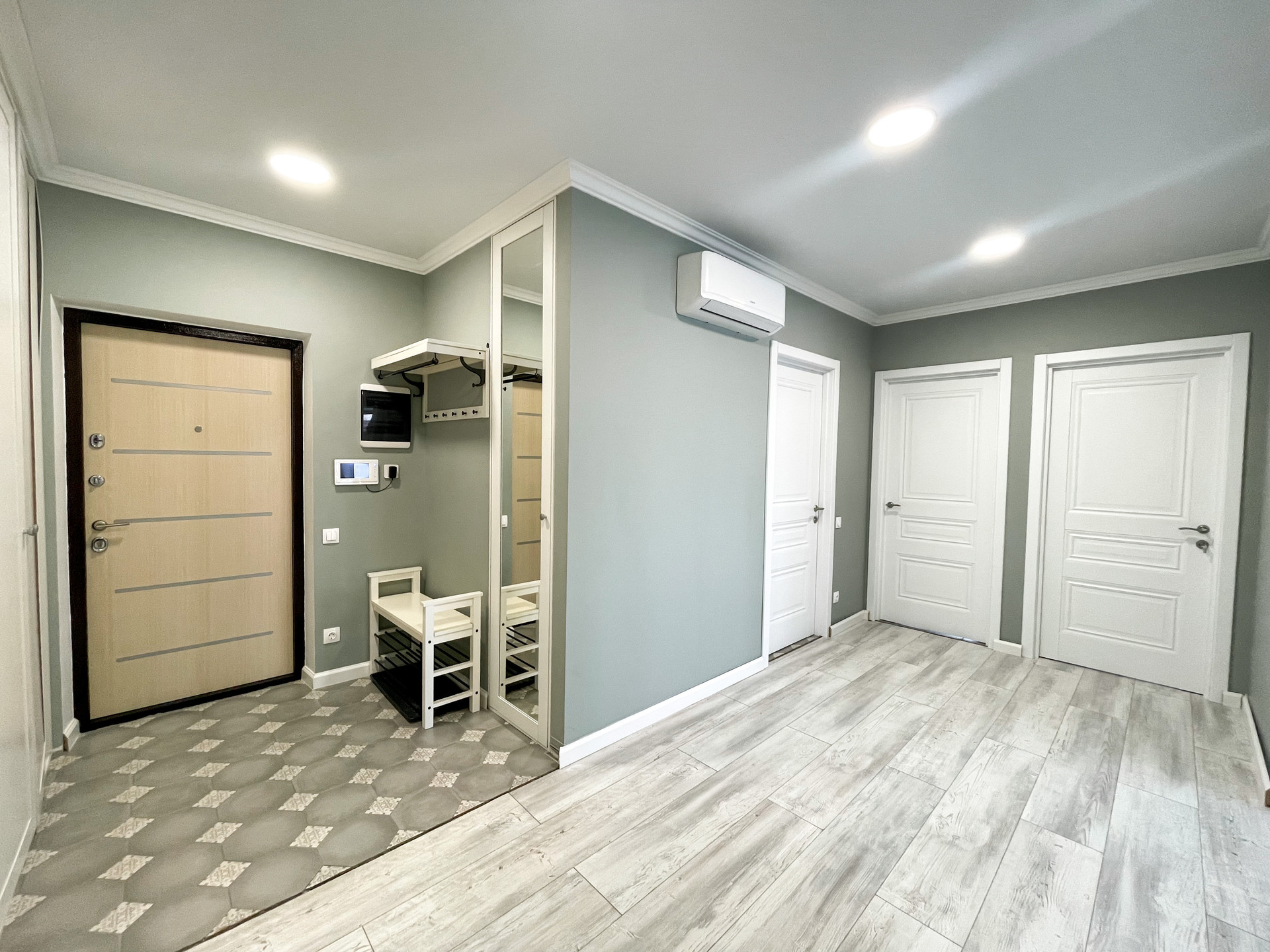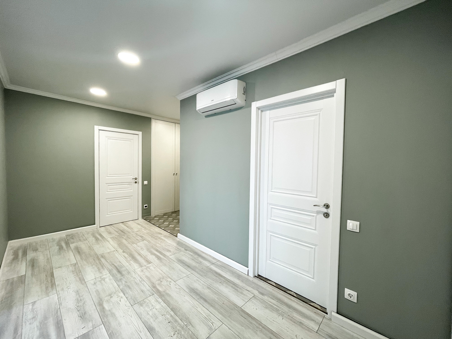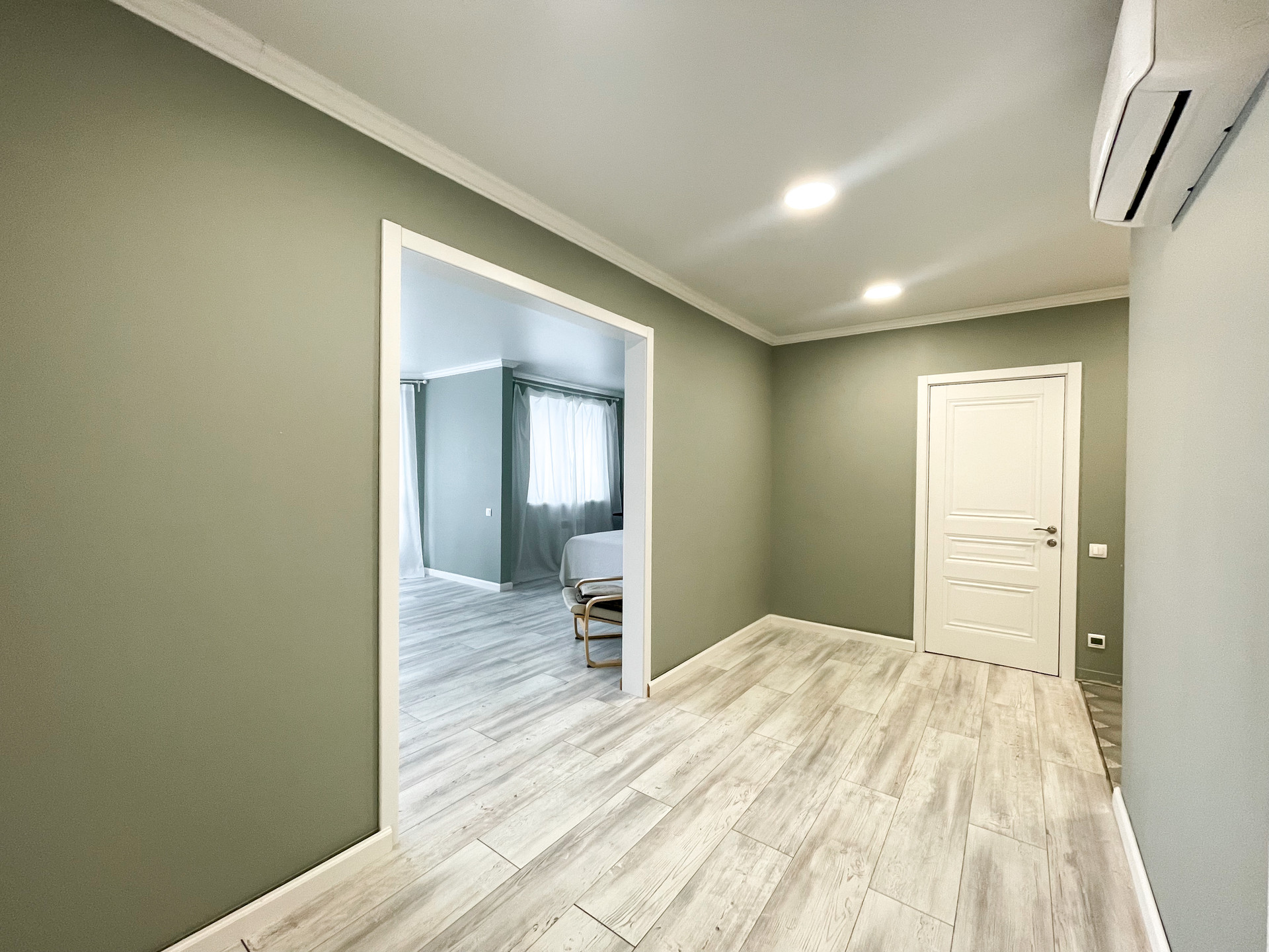 на полу ламинат, стены под покраску, натянут потолок с точечным освещением.