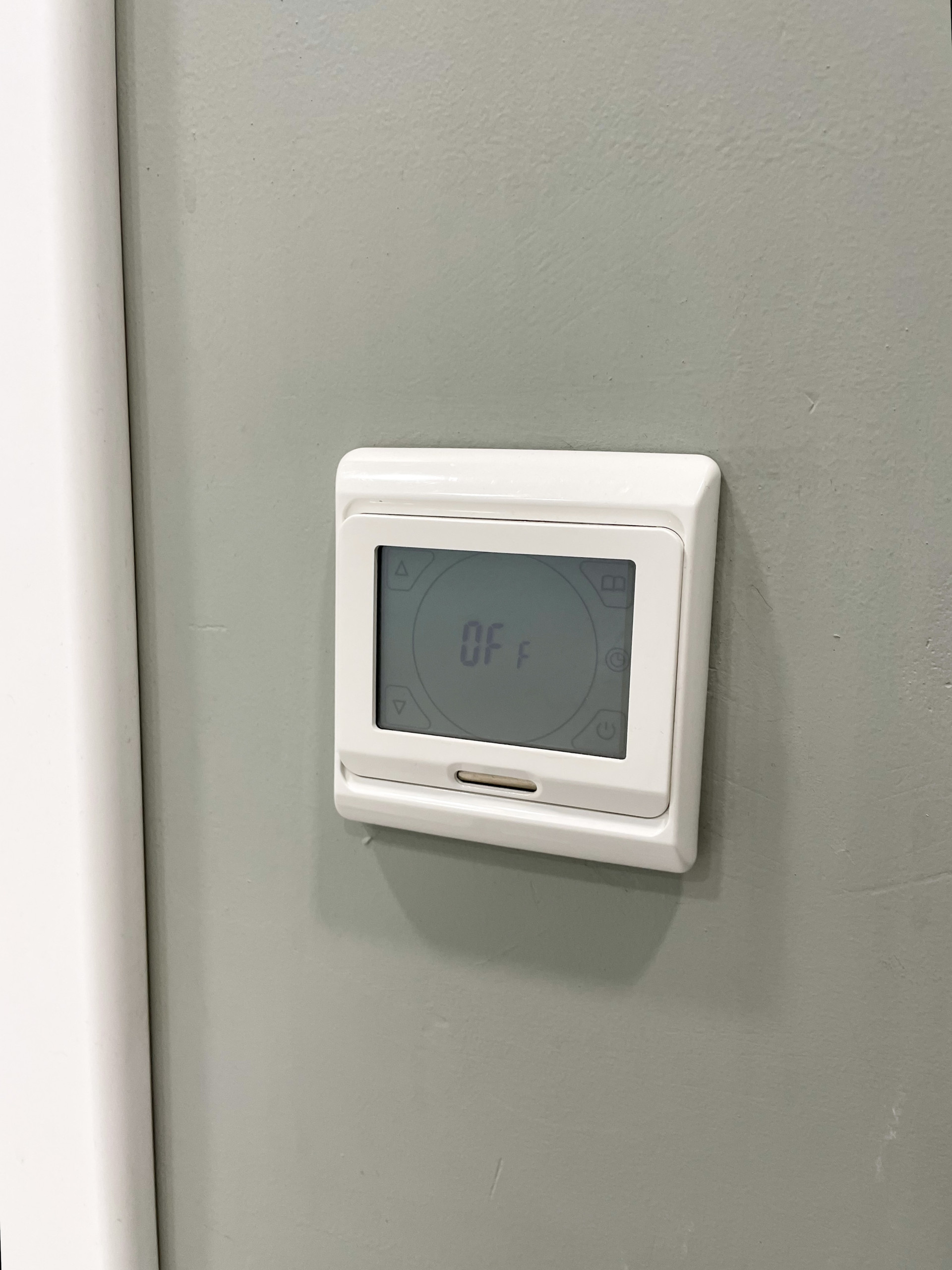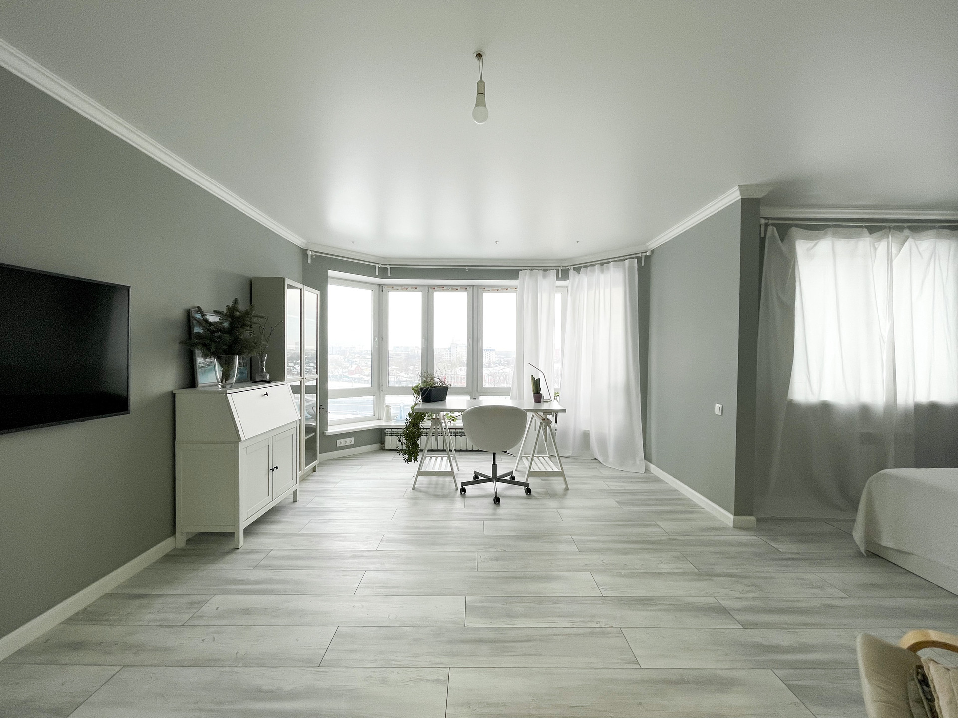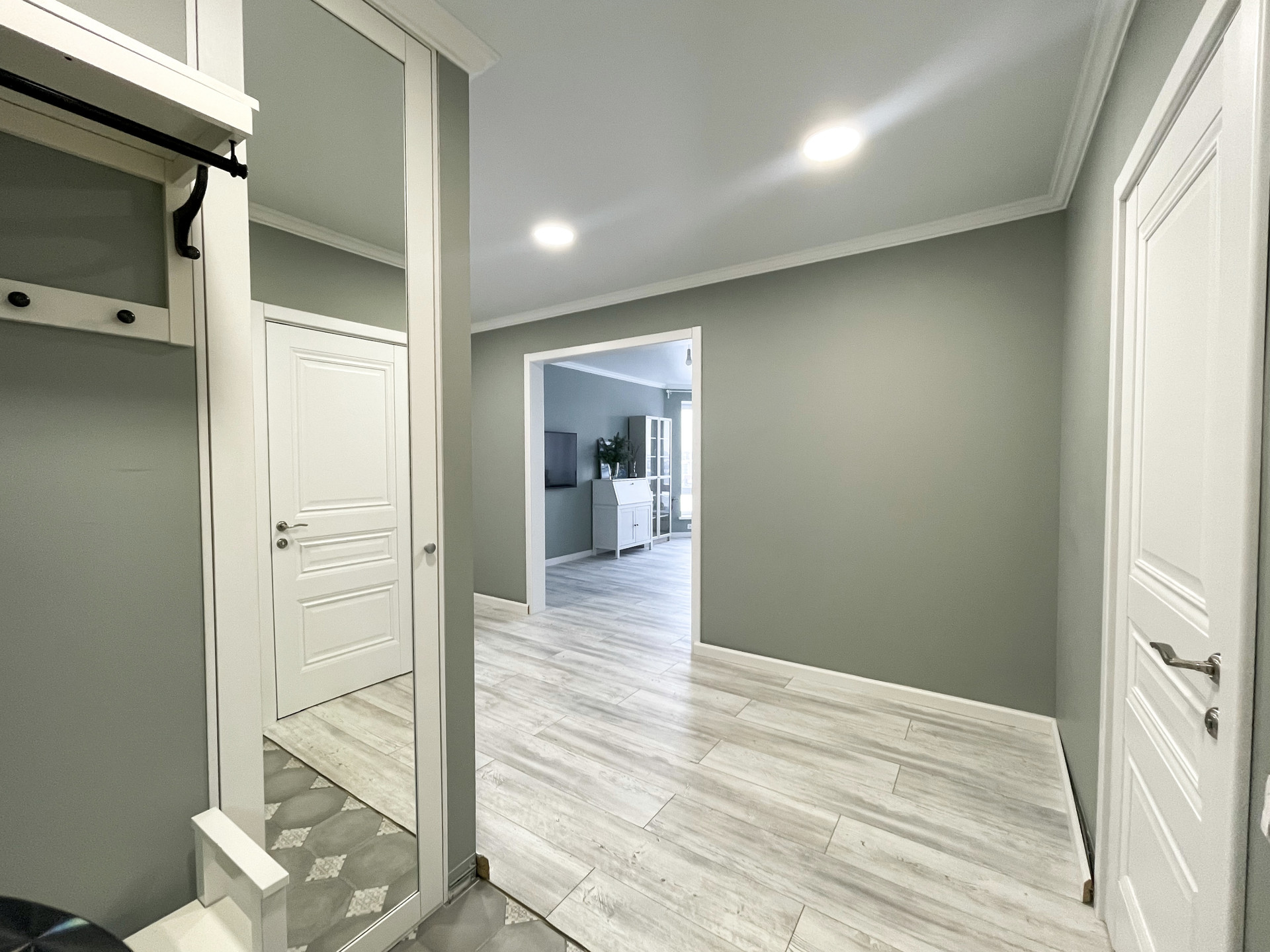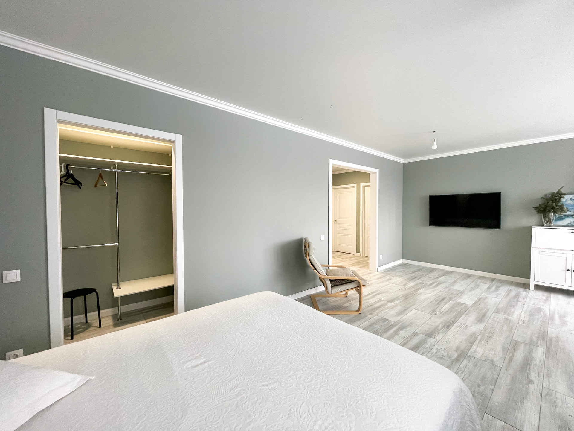 на полу ламинат, стены под покраску, натянут потолок с точечным освещением.
