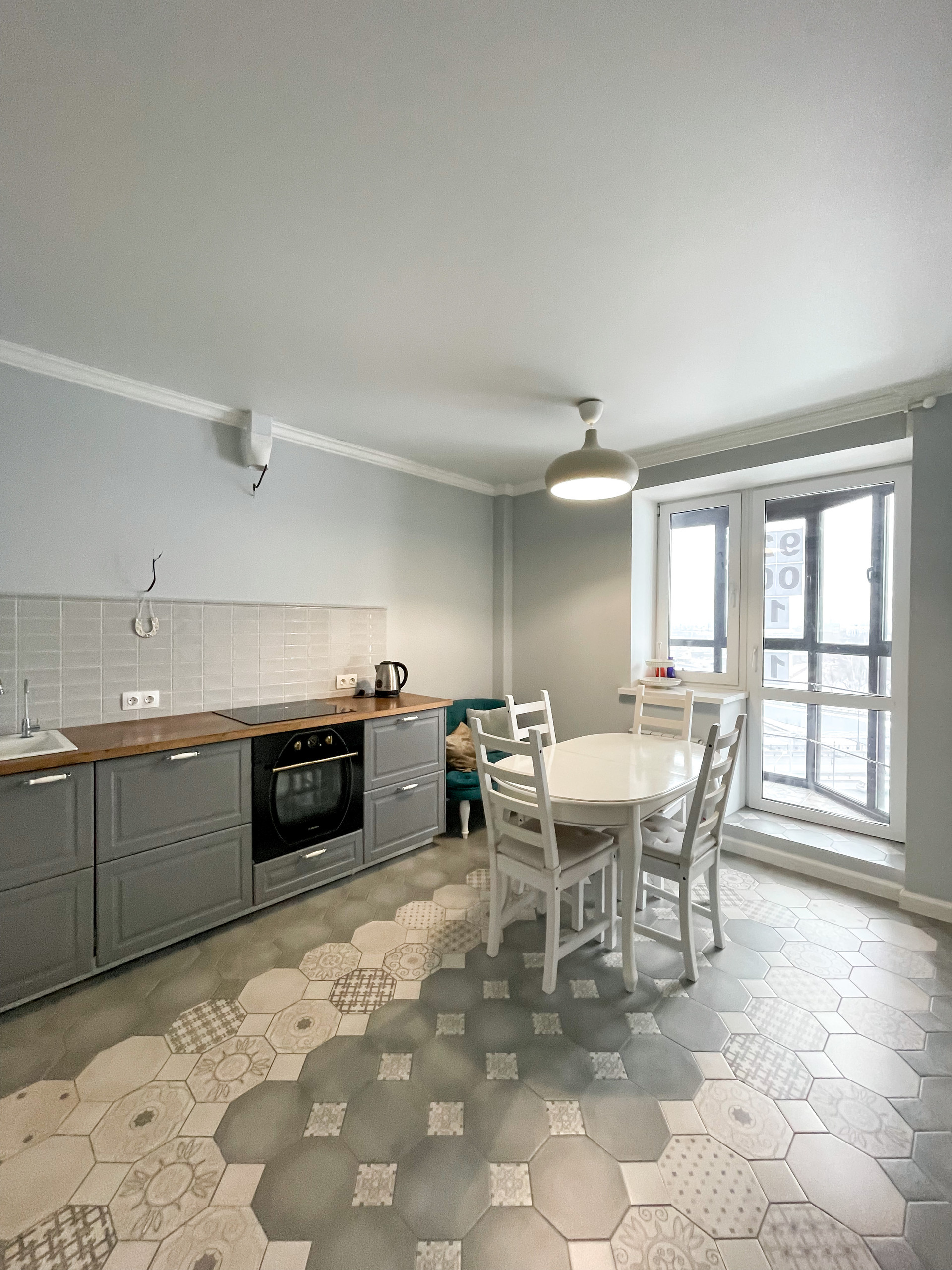 Установлен кухонный гарнитур со всей техникой (холодильник, плита, духовка, посудомойка, кондиционер), шкаф-купе, гардеробная.