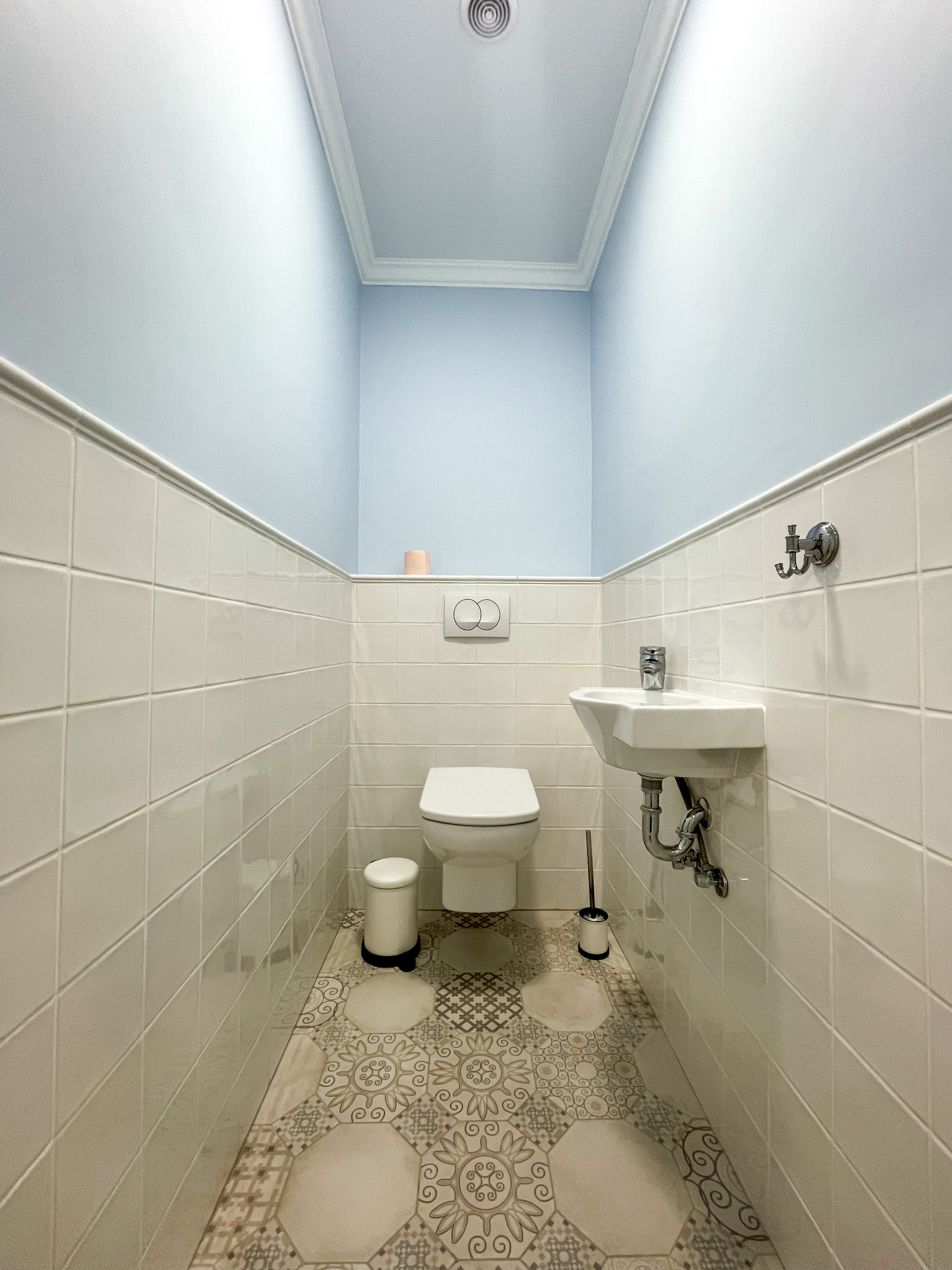 В ванной удобная ниша со стиральной машиной и местами для хранения.