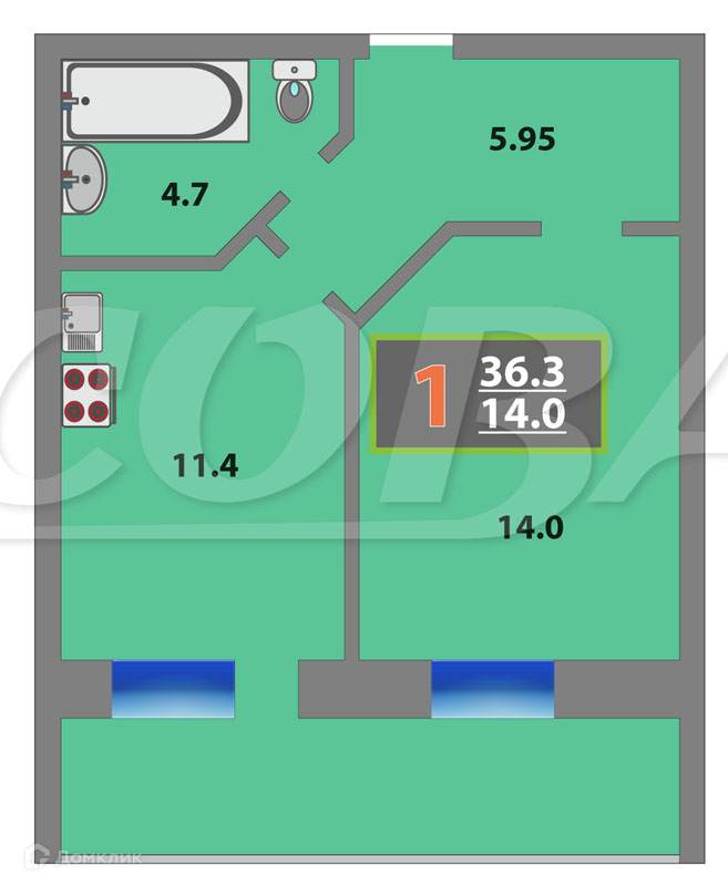 Общая площадь 35 м2