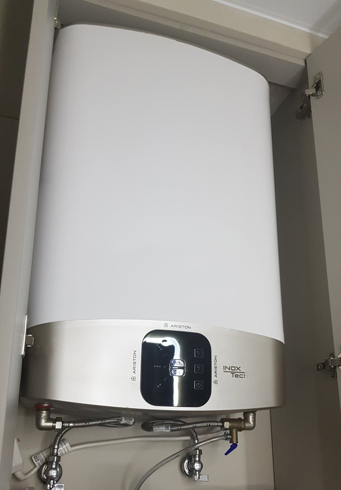 Установлен водонагреватель Ariston на 50 литров. Остаётся в квартире.