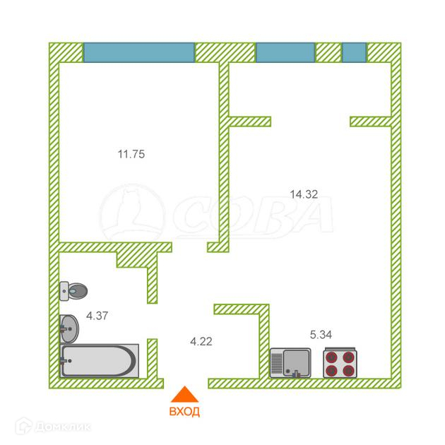 1-комнатная квартира, 40.2 м2, этаж 11 / 12, на продажу в Тюмени, Алматинская улица, 4