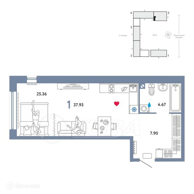 Квартира студия, 37.4 м2, этаж 9 / 12, на продажу в Тюмени, Алматинская улица, 4