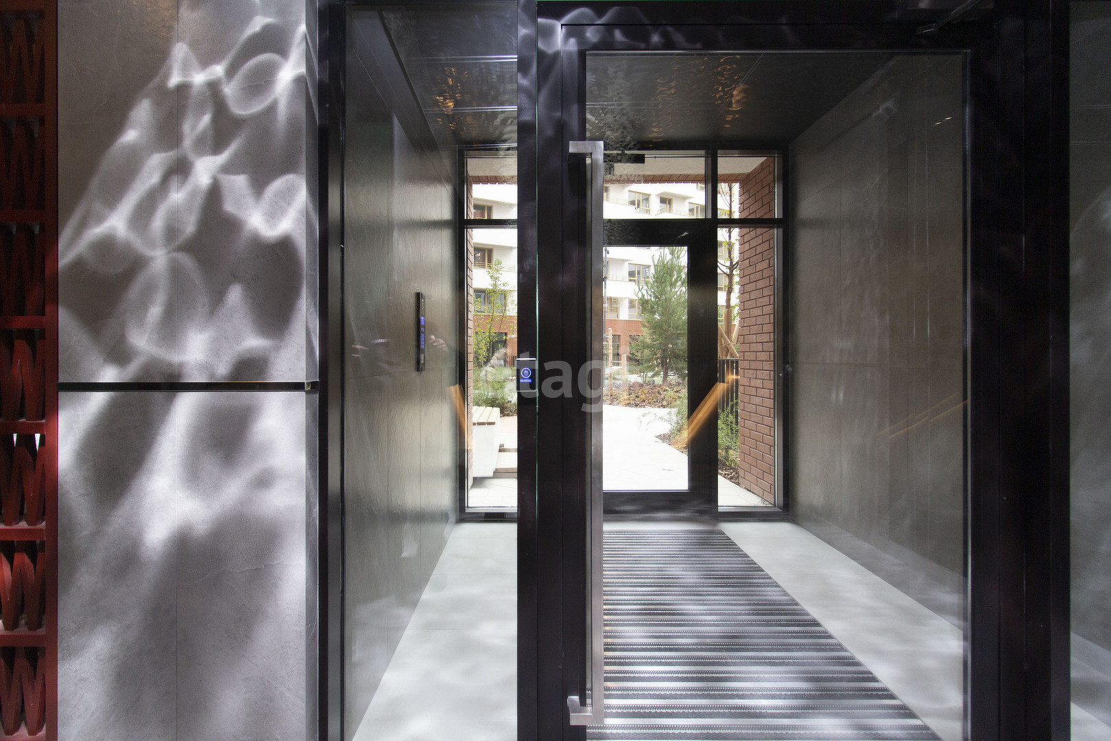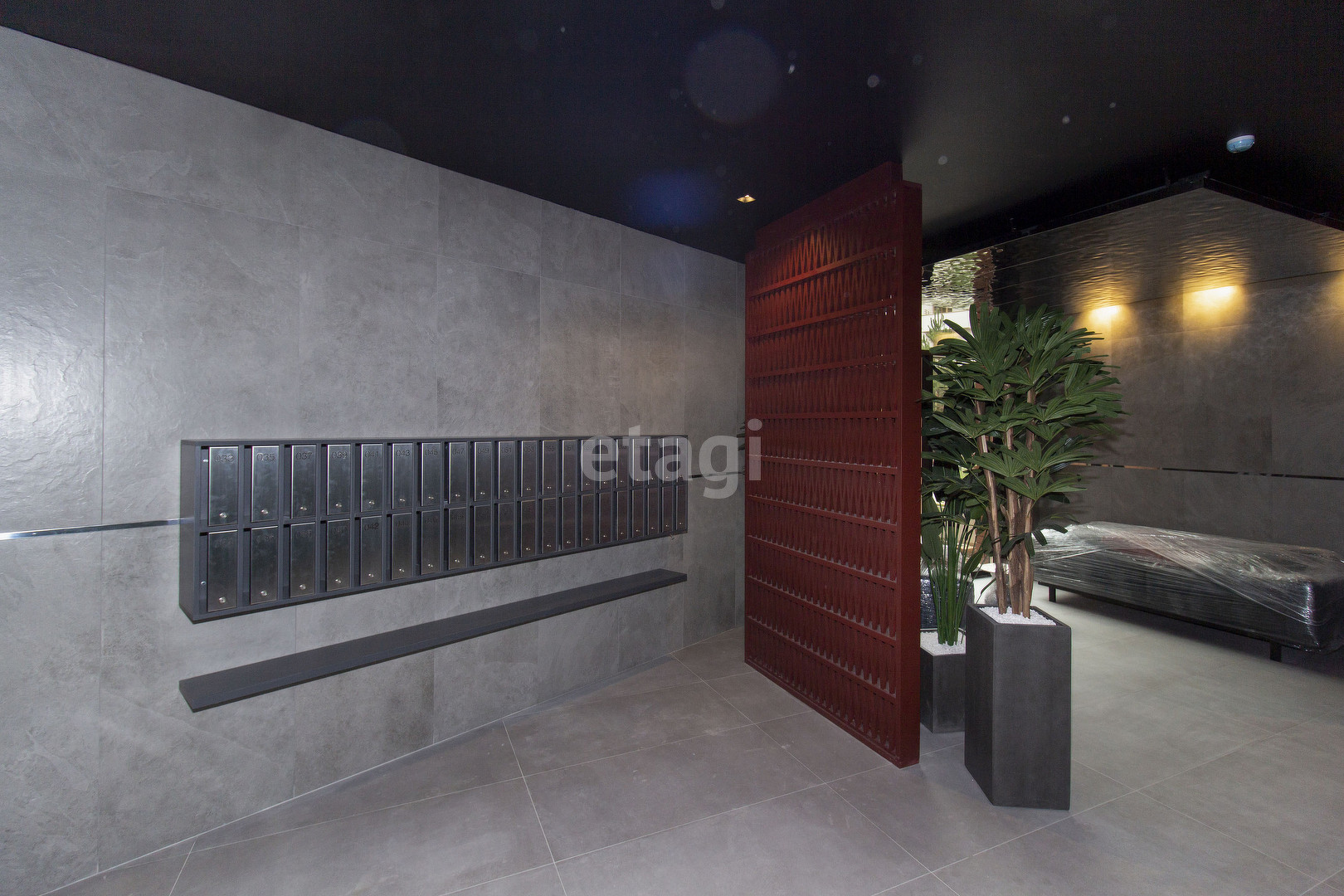 Уютный подъезд с зеркалами, картинами и мягкими зонами отдыха.