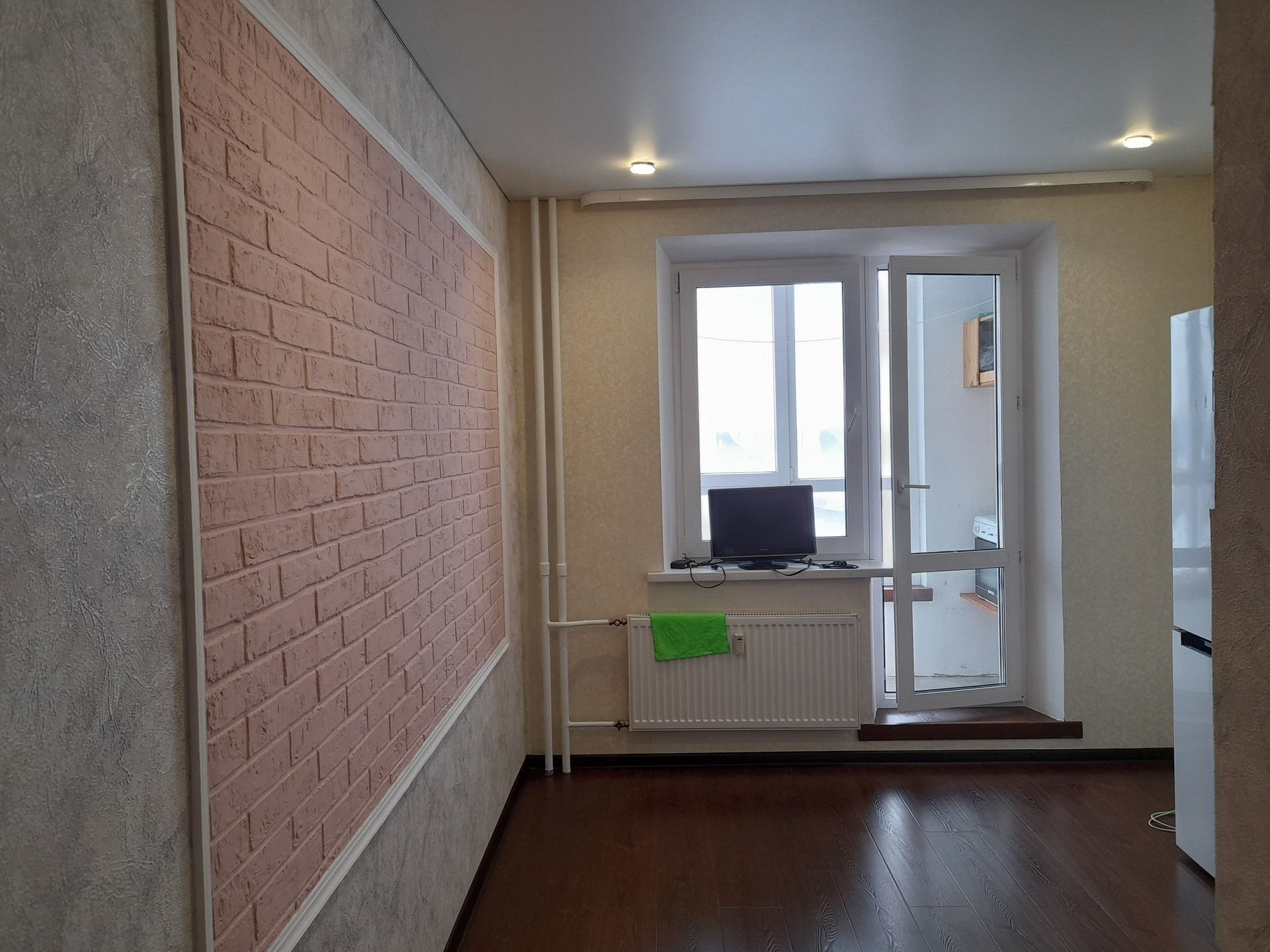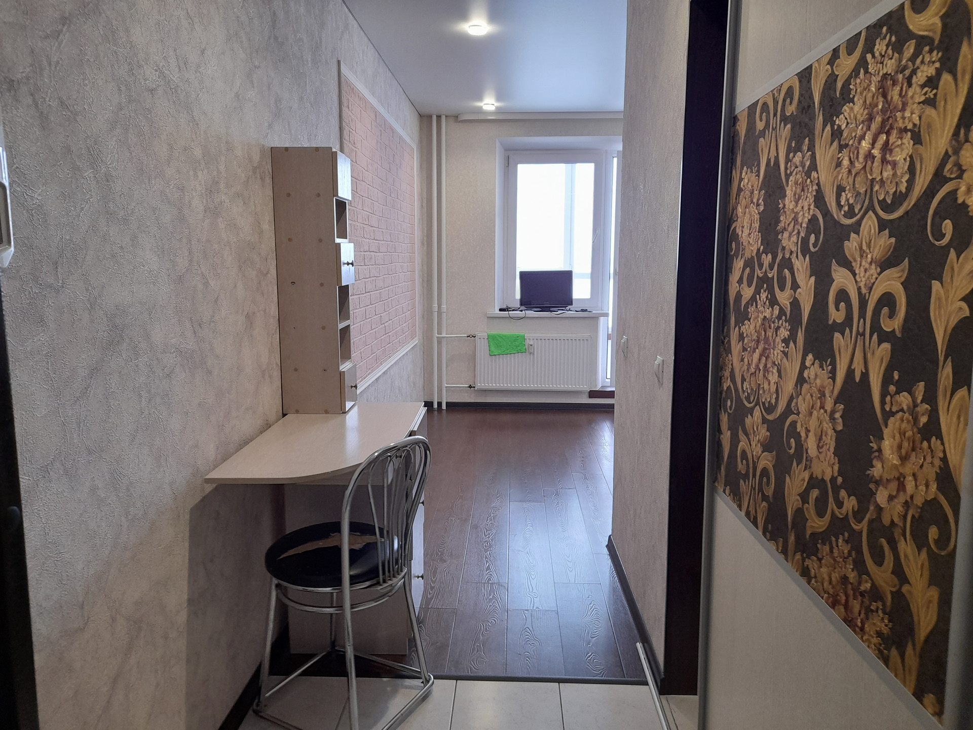 Квартира-студия с косметическим ремонтом в новом доме в новом микрорайоне. Выровненные стены, матовые натяжные потолки. На полу ламинат. Есть кухонный уголок с мойкой. Застекленный балкон. Санузел совмещенный в кафеле. Установлена вся сантехника: ванна, унитаз.