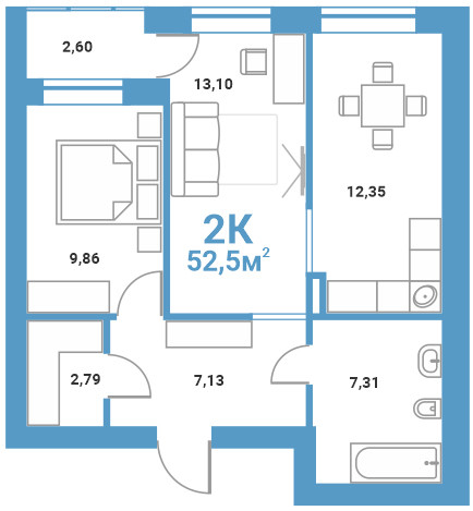 Общая площадь 52.5 м2