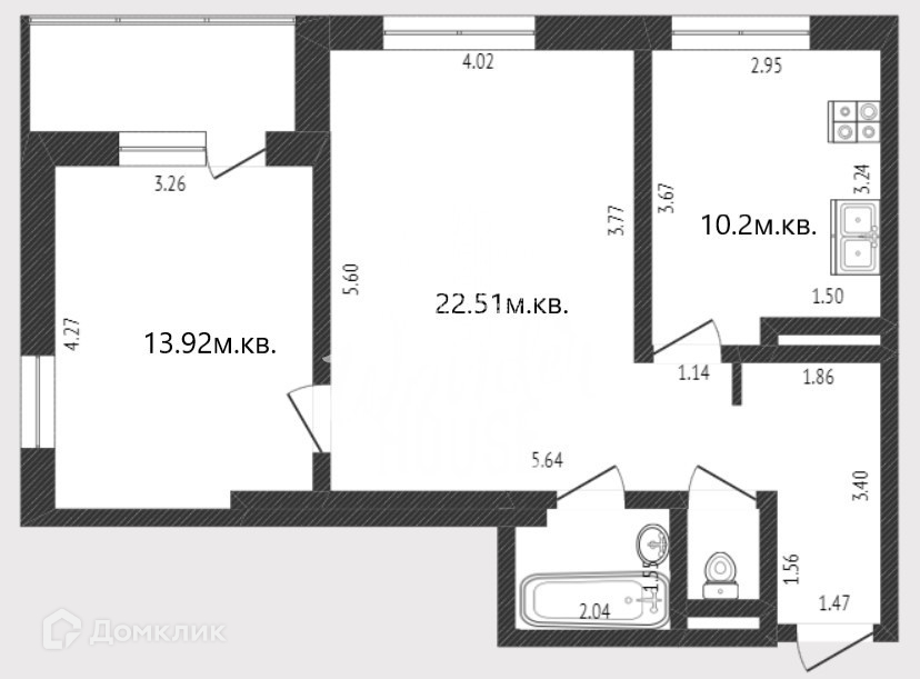 из зала имеются выходы в лаконичную кухню площадью 10,2м.кв., а так же в спальную комнату 13,92м.кв, из которой в свою очередь имеется выход на застекленную лоджию;