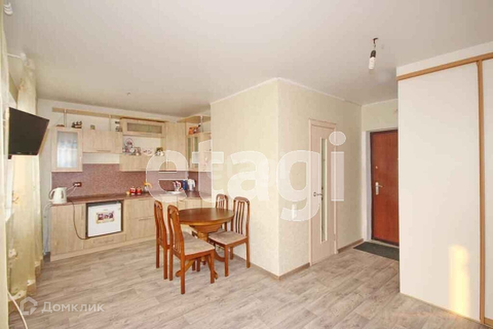 Квартира студия, комната большая, просторная, 2 окна, лоджия 6 м.кв., остеклена, окна во двор (тихо). Свежий, современный ремонт, в светлых тонах, натяжной, матовый потолок, на стенах дорогие, качественные обои, на полу хороший ленолиум фирмы Таркет. При продаже остается встроенный кухонный гарнитур хорошего качества, встроенный шкаф. Санузел совмещен, сантехника новая, на полу керамическая плитка, стены отштукатурены подготовлены под укладку плитки. Лифт пассажирско-грузовой с двумя выходами. Динамично развивающийся район, школа, сады, поликлиника, магазины все в шаговой доступности.