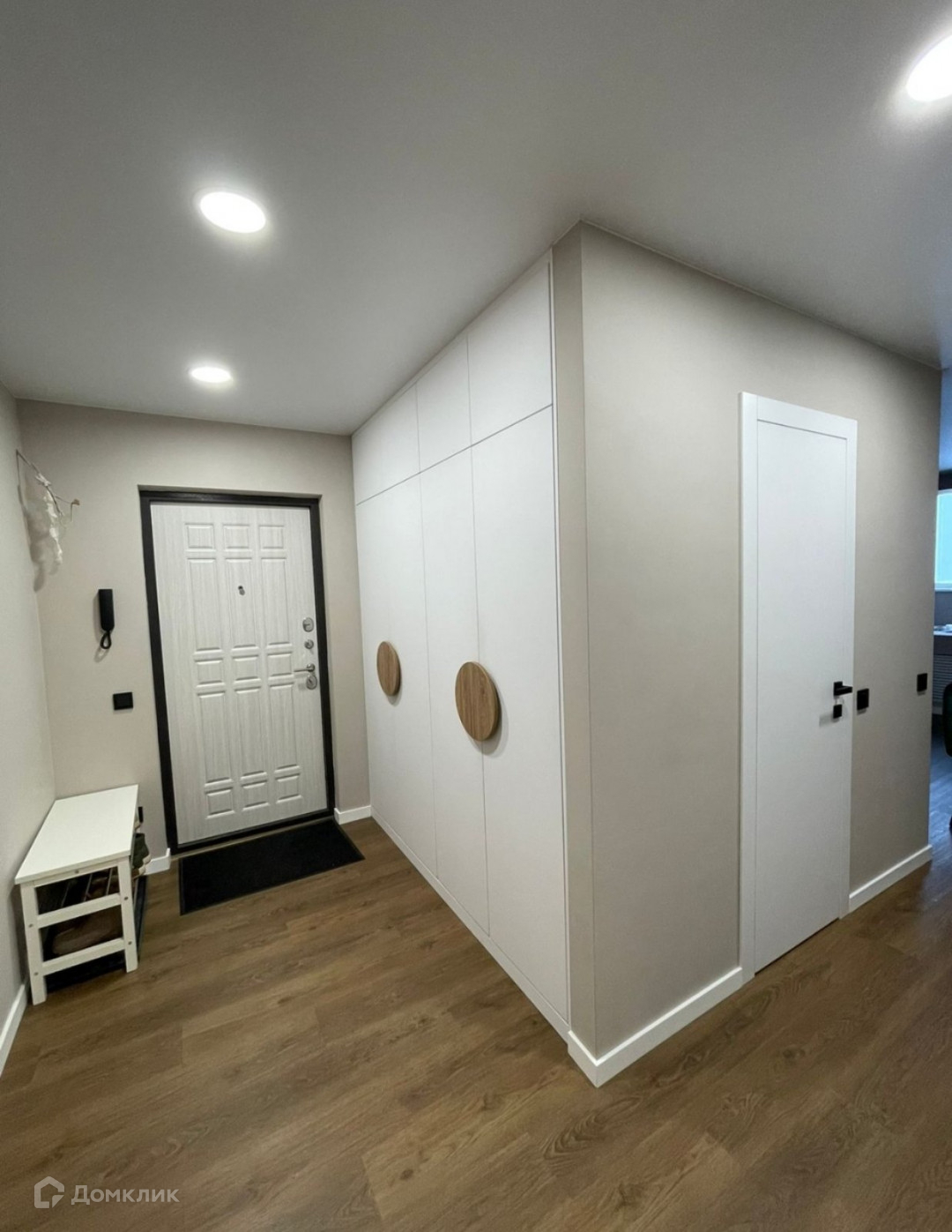 - В спальне построили гардеробную, с удобными полками, выдвижными держателями для брюк, для галстуков. Дверь можно будет выбрать на ваш вкус, мы не успели заказать