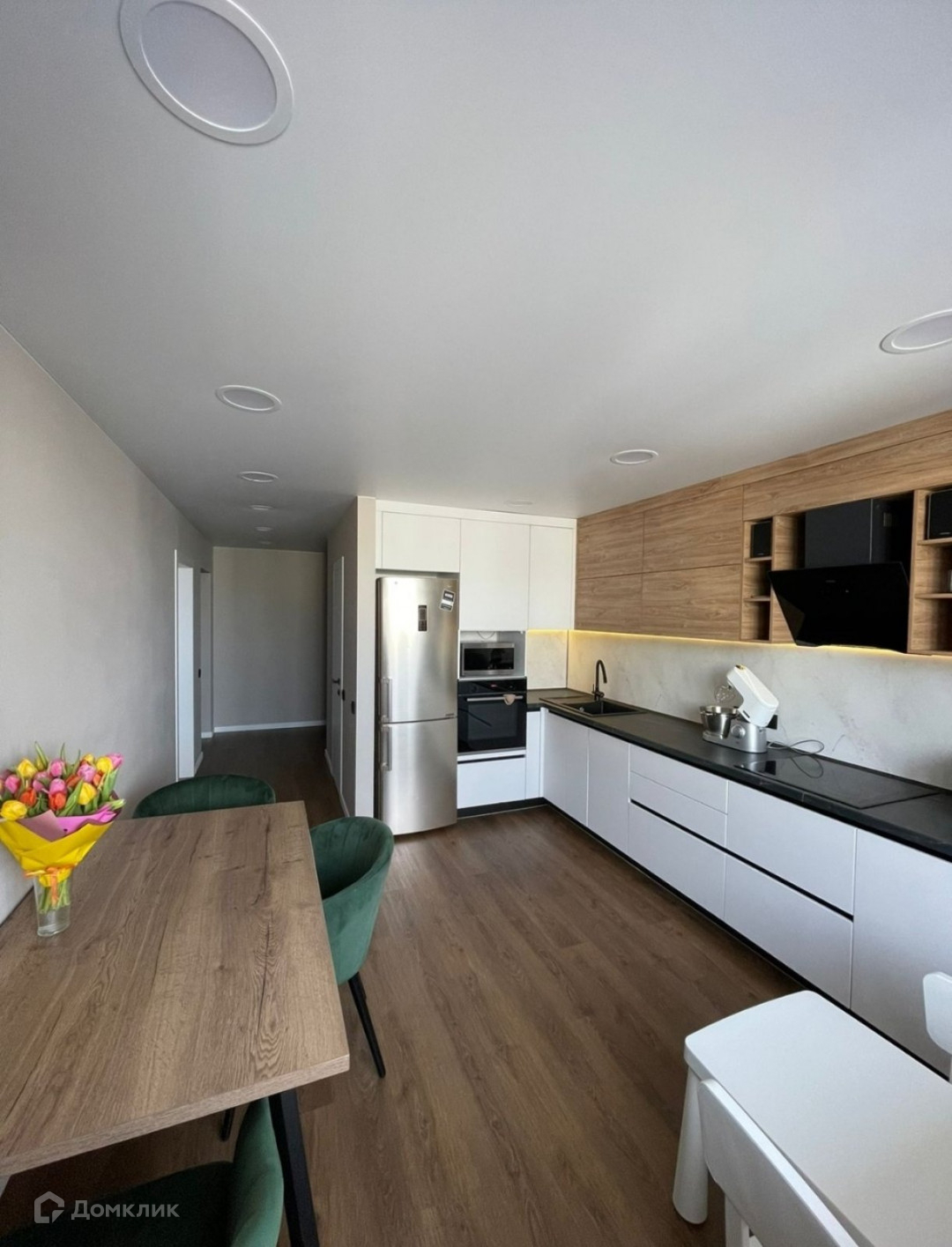 В квартире остаётся вся встроенная мебель и техника: духовой шкаф Bosh и электрическая плита Bosh, вытяжка Haier, посудомоечная машина Electrolux.
