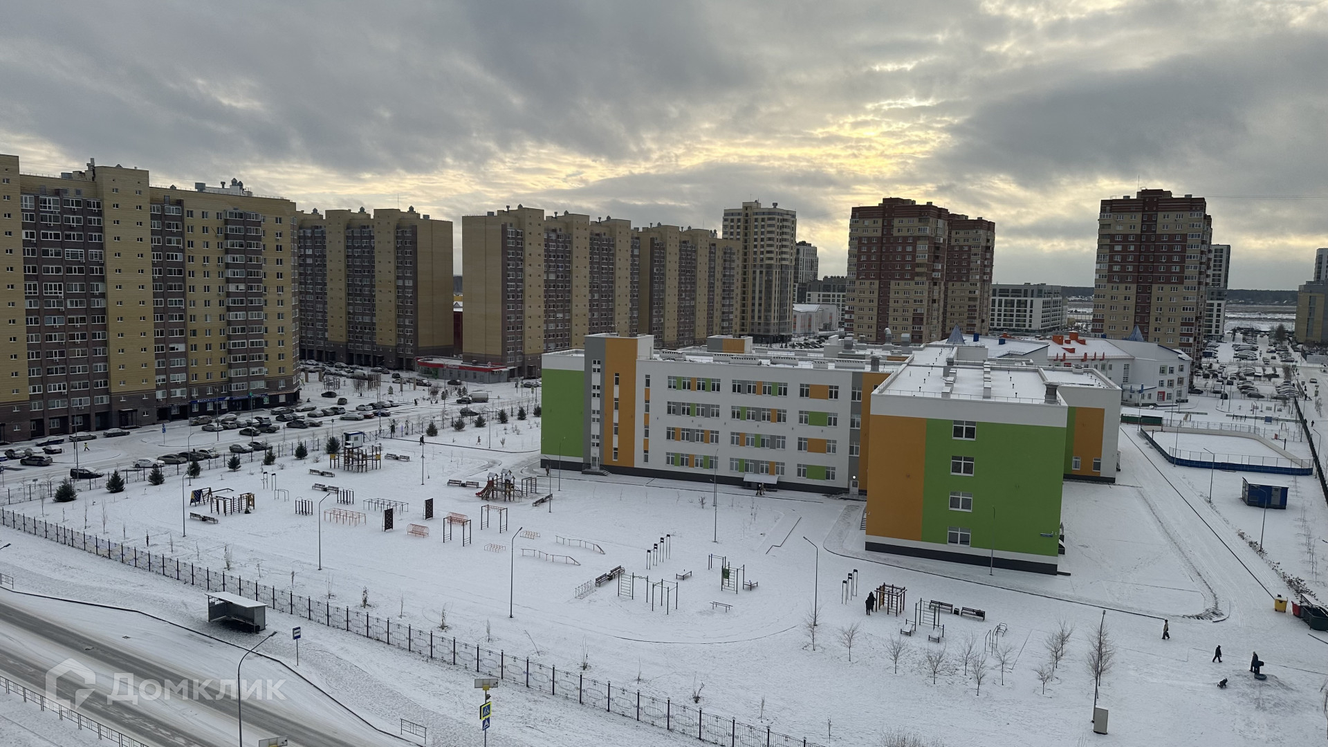 Окна выходят на солнечную сторону, на школу и детский сад.