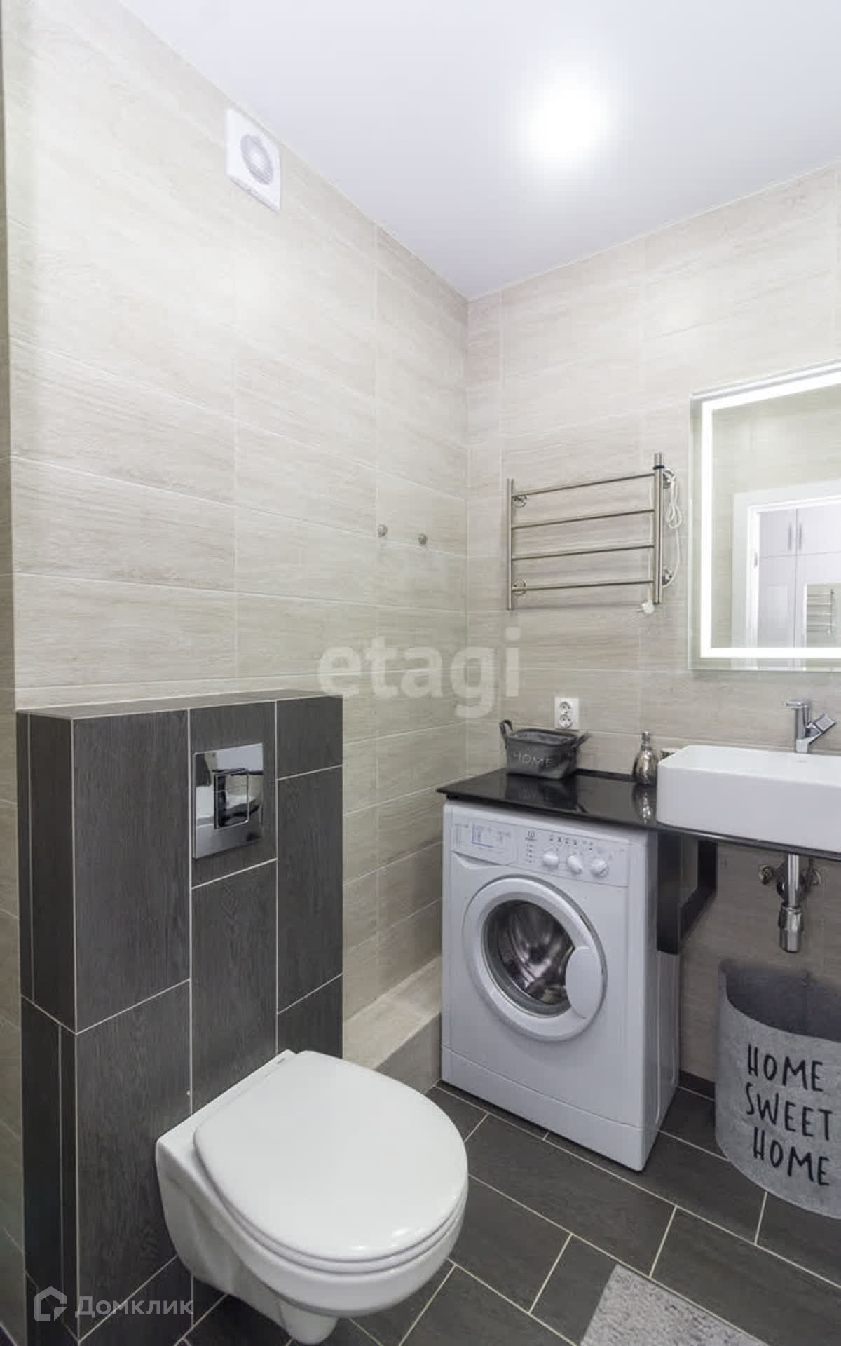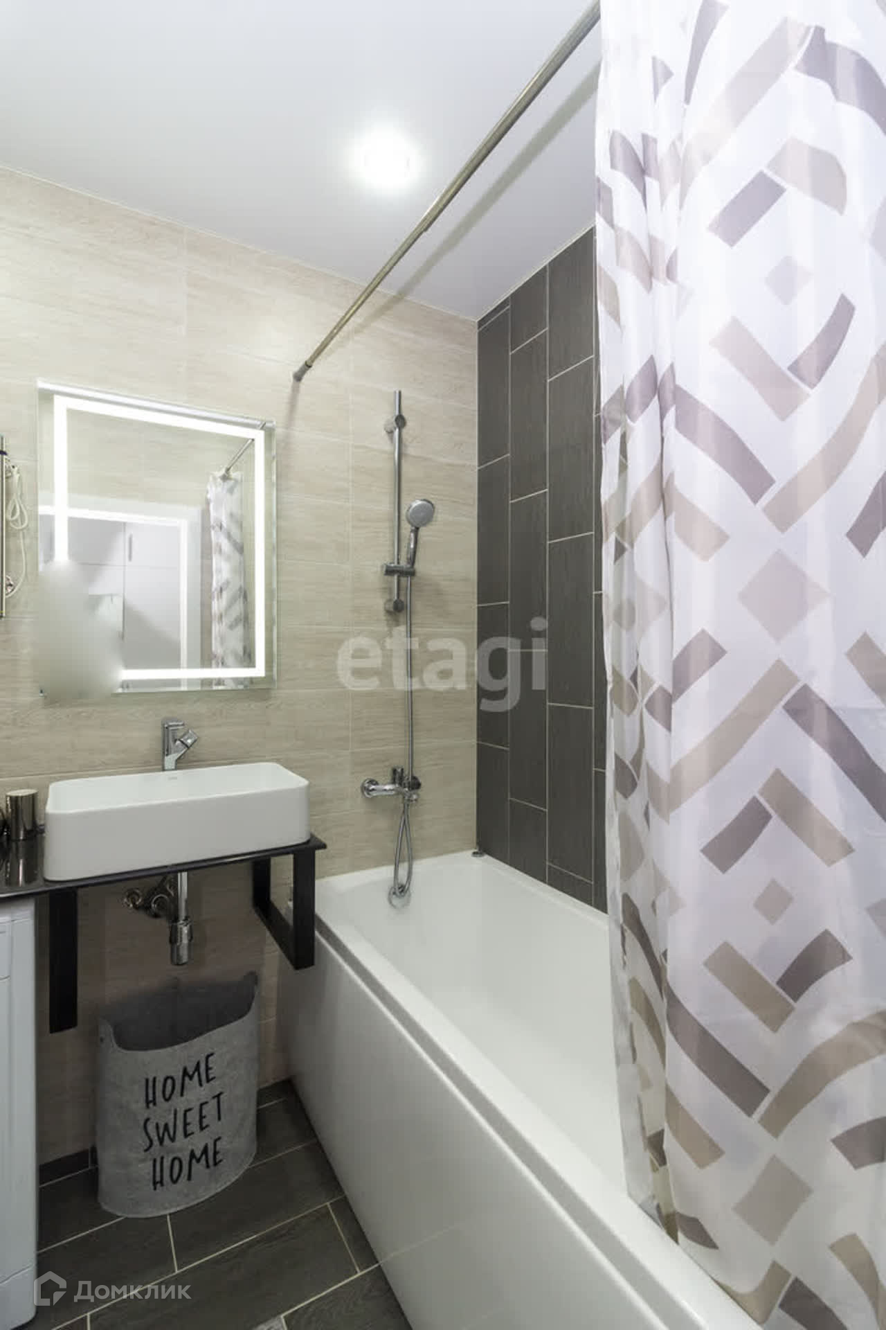 В квартире выполнен современный ремонт: натяжной потолок с точечными светильниками, на полу ламинат, на стенах обои. Санузел в кафеле, унитаз с инсталяцией, установлена ванна и раковина.