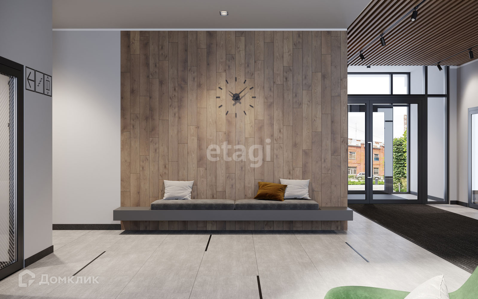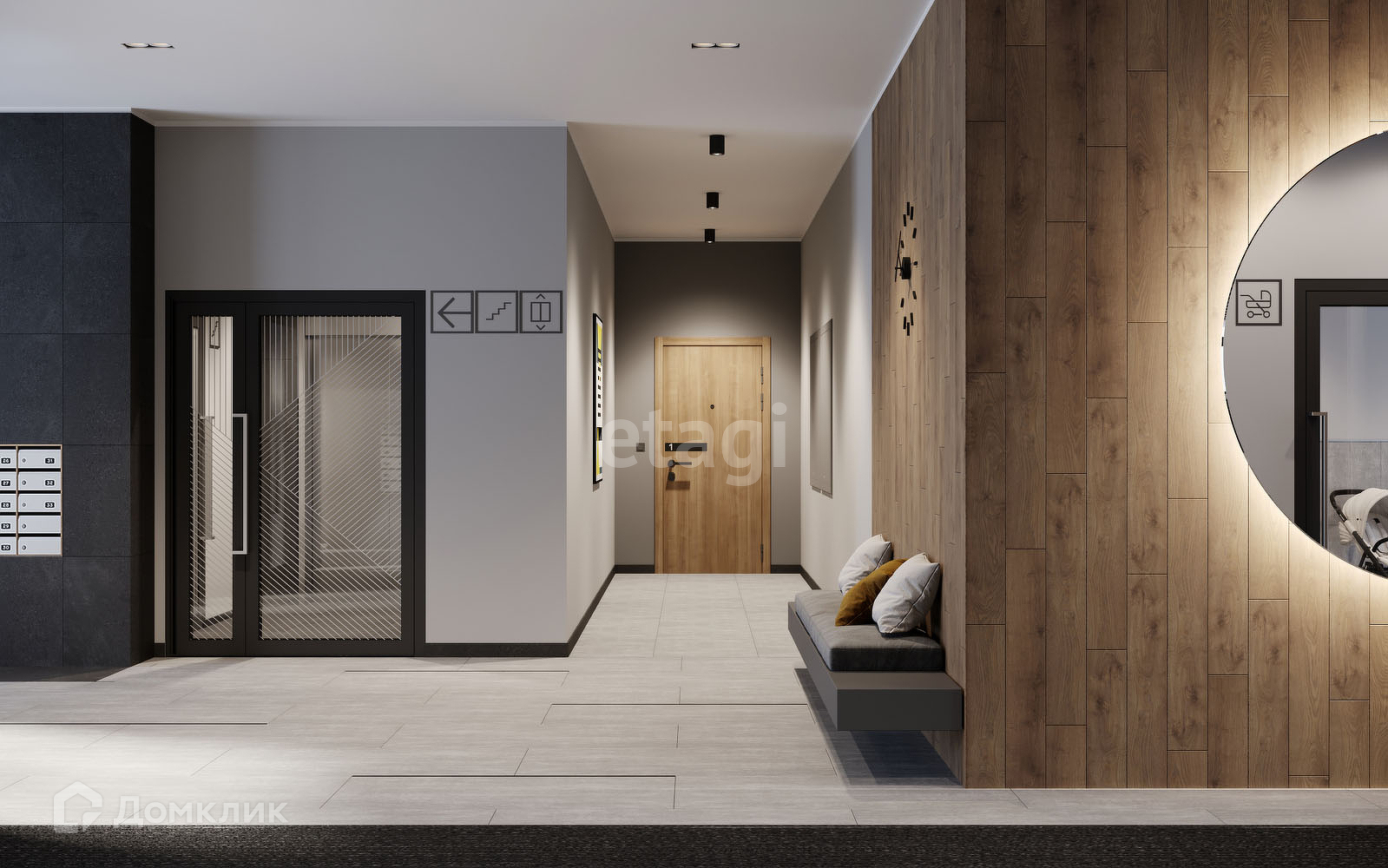 Для подъезда дома разработан дизайнерский интерьер: продуманы мягкие зоны отдыха и ожидания гостей, сделан просторный и светлый лифтовой холл с зеркалами и картинами.