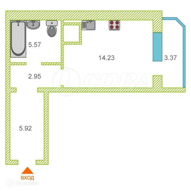 Общая площадь 28.5 м2