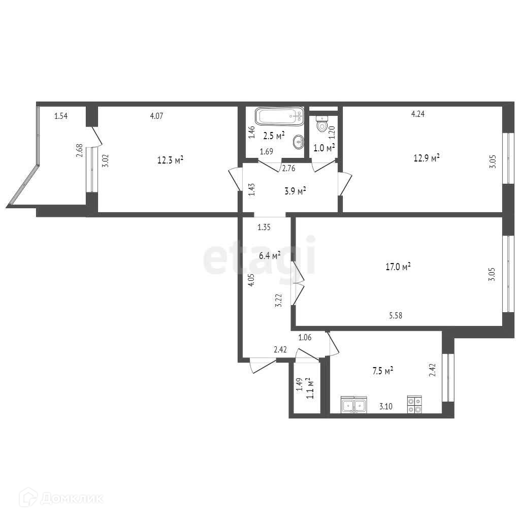 3-комнатная квартира, 65.1 м2, этаж 3 / 9, на продажу в Тюмени, улица Пермякова, 25