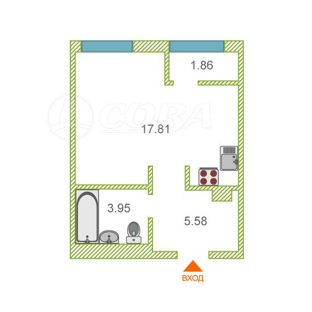 Квартира студия, 29.3 м2, этаж 9 / 10, на продажу в Тюмени, улица Александра Федоровича, 12