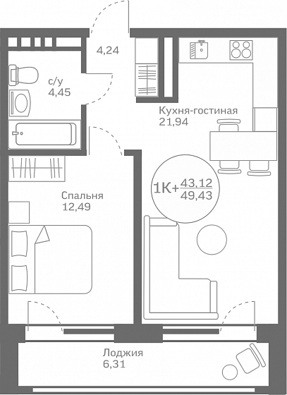 Общая площадь 49.43 м2
