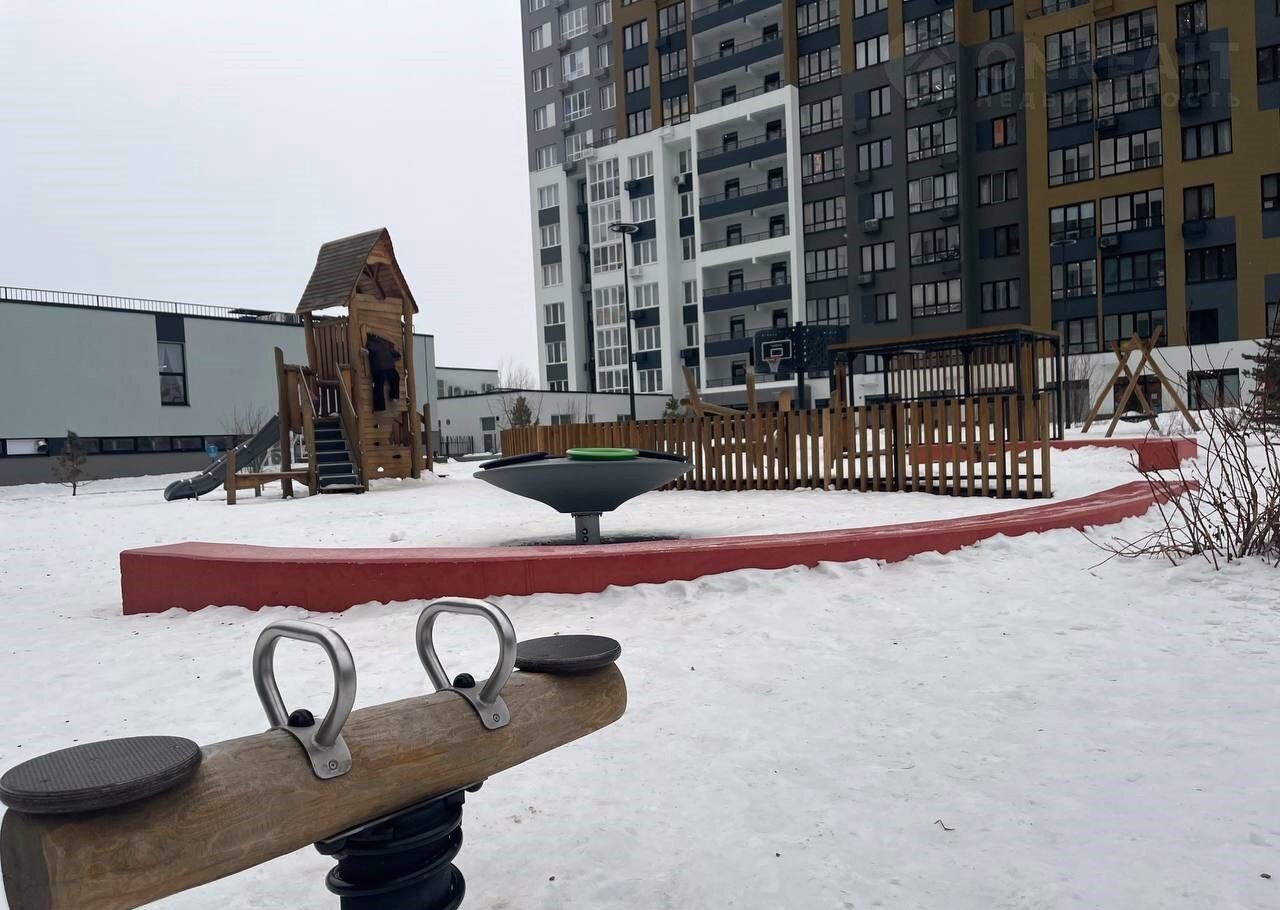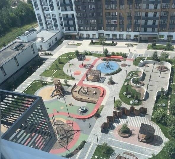 Oкна квартиры выxодят во двор — закрытую территорию с видеонаблюдением и современной детской площадкой для детей всех возрастов.