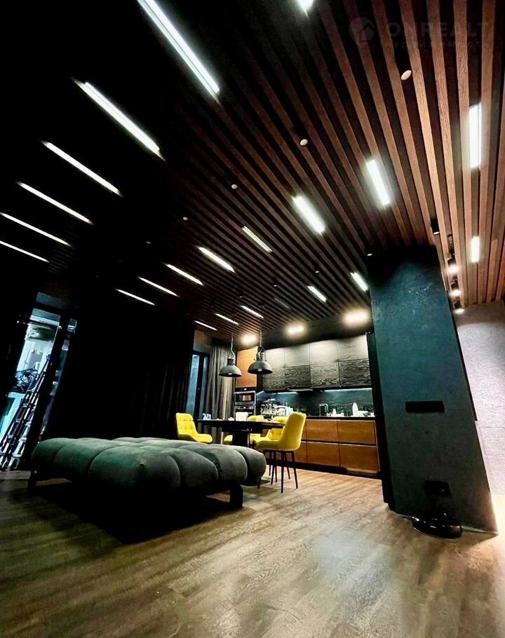 — Просторное пространство кухня-гостиная с потолком-артобъектом: деревянные рейки и матово-черные элементы создают современный контраст.
