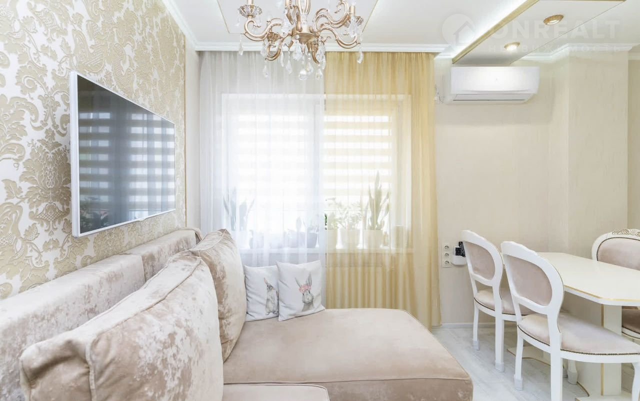 Квартира выполнена с качественным ремонтом в современном стиле. В прихожей и на кухне уложен керамогранит с системой «теплый пол», в комнатах — практичный ламинат. Лоджия площадью 10 м² оснащена витражным остеклением, что обеспечивает хорошее естественное освещение и панорамный обзор. Окна выходят во двор, гарантируя тишину и отсутствие уличного шума. В стоимость входит кухонный гарнитур и бойлер, что избавляет от необходимости дополнительных затрат на обустройство.
