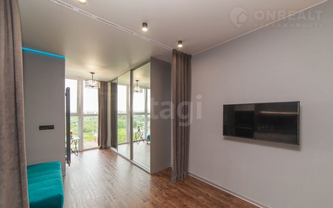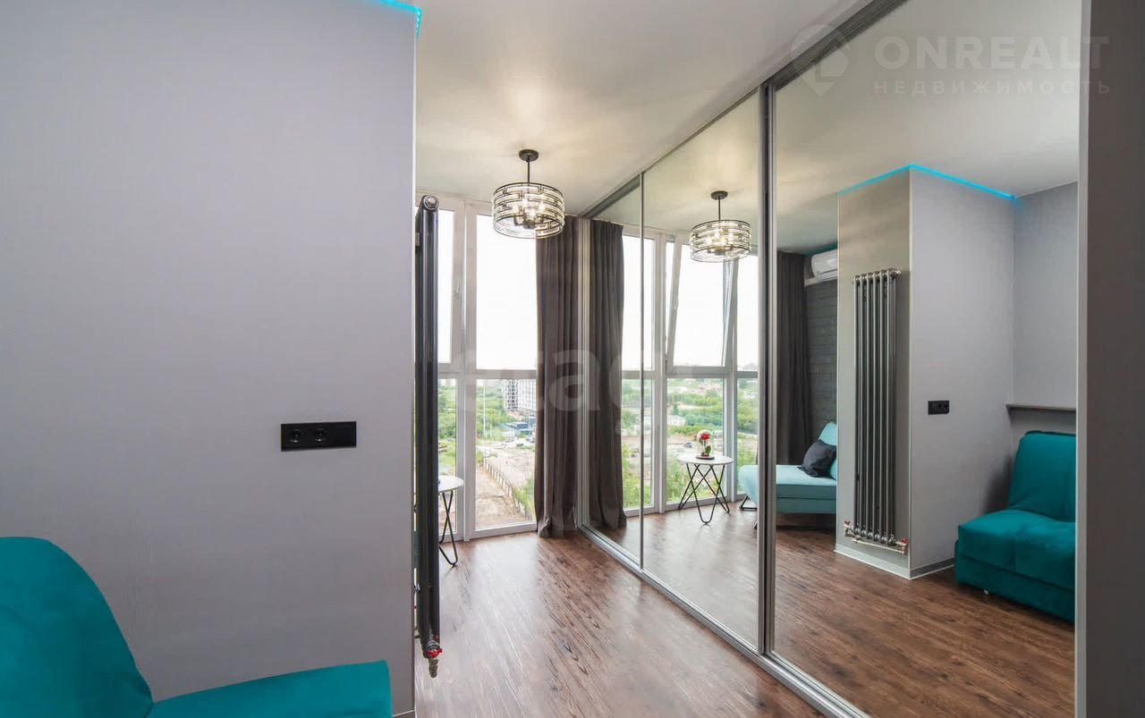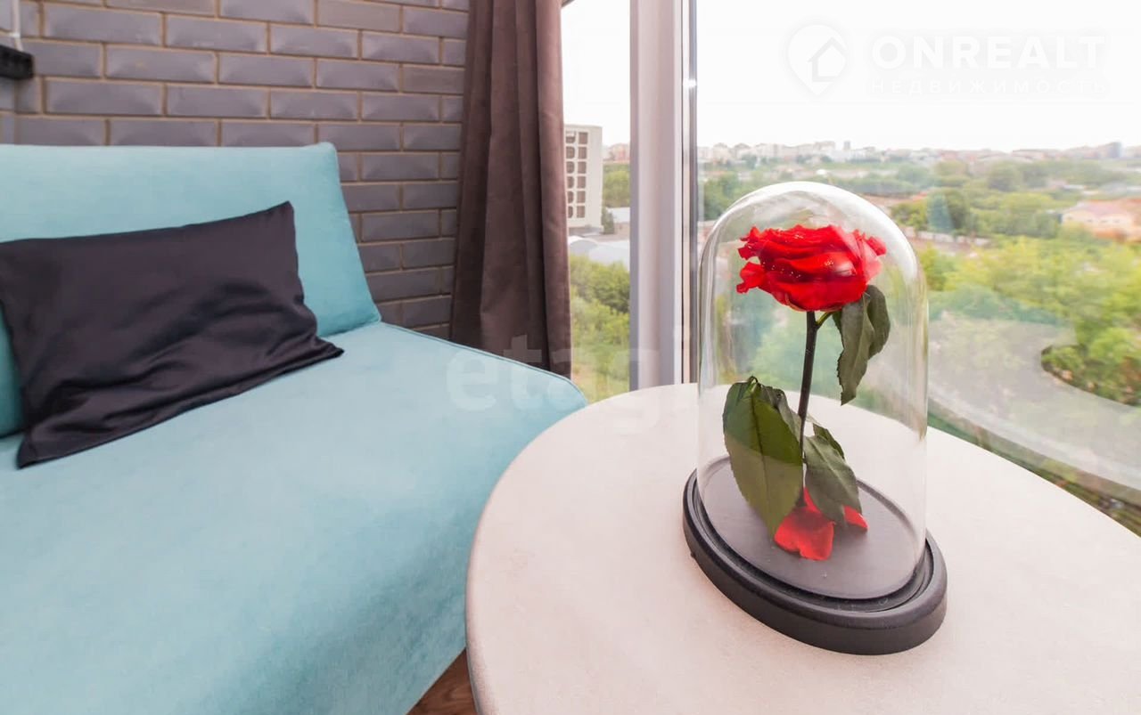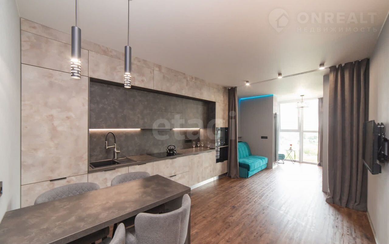 Квартира находится в 10 минутах езды от центра, что обеспечивает удобную транспортную доступность при спокойной атмосфере жилого комплекса. Общая площадь студии грамотно зонирована: выделены полноценная кухня, спальное место и гостиная зона, а утепленный балкон с панорамным остеклением можно использовать как кабинет или зону отдыха.