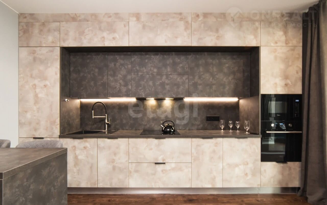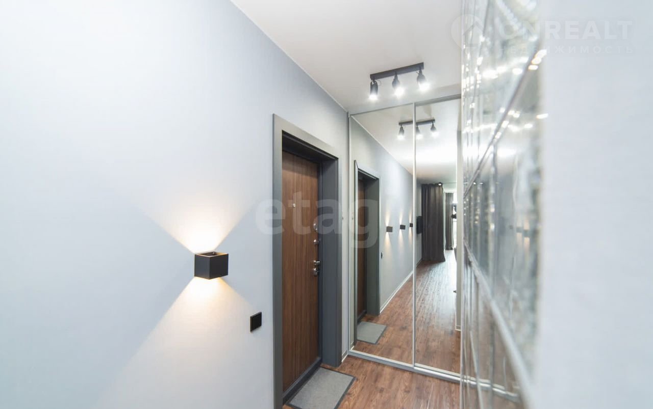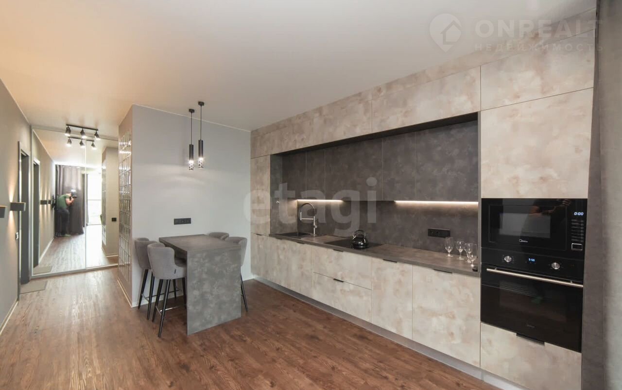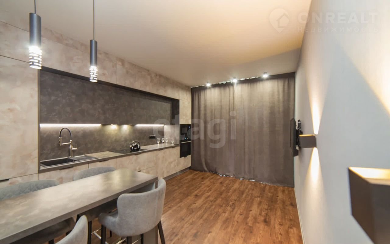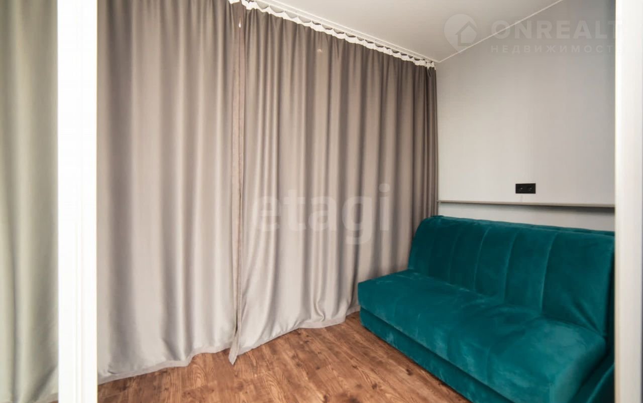 Квартира находится в 10 минутах езды от центра, что обеспечивает удобную транспортную доступность при спокойной атмосфере жилого комплекса. Общая площадь студии грамотно зонирована: выделены полноценная кухня, спальное место и гостиная зона, а утепленный балкон с панорамным остеклением можно использовать как кабинет или зону отдыха.