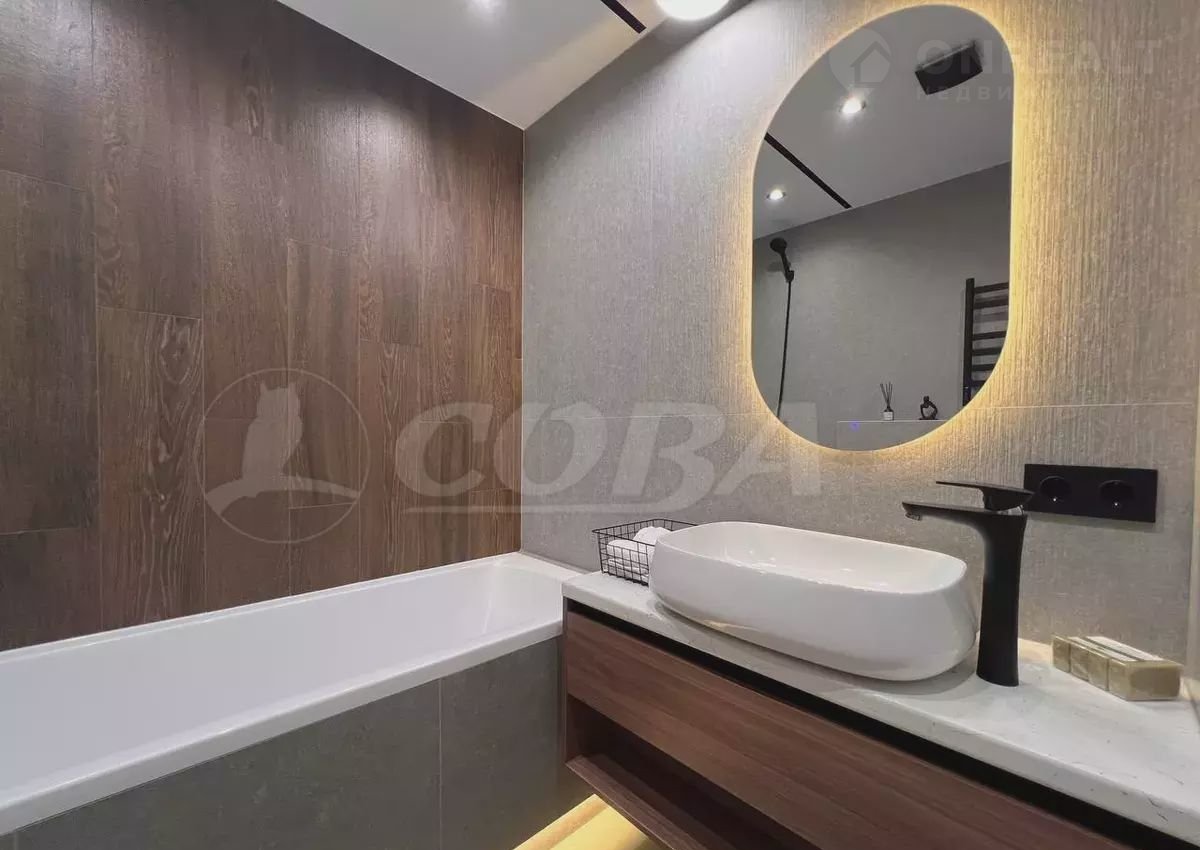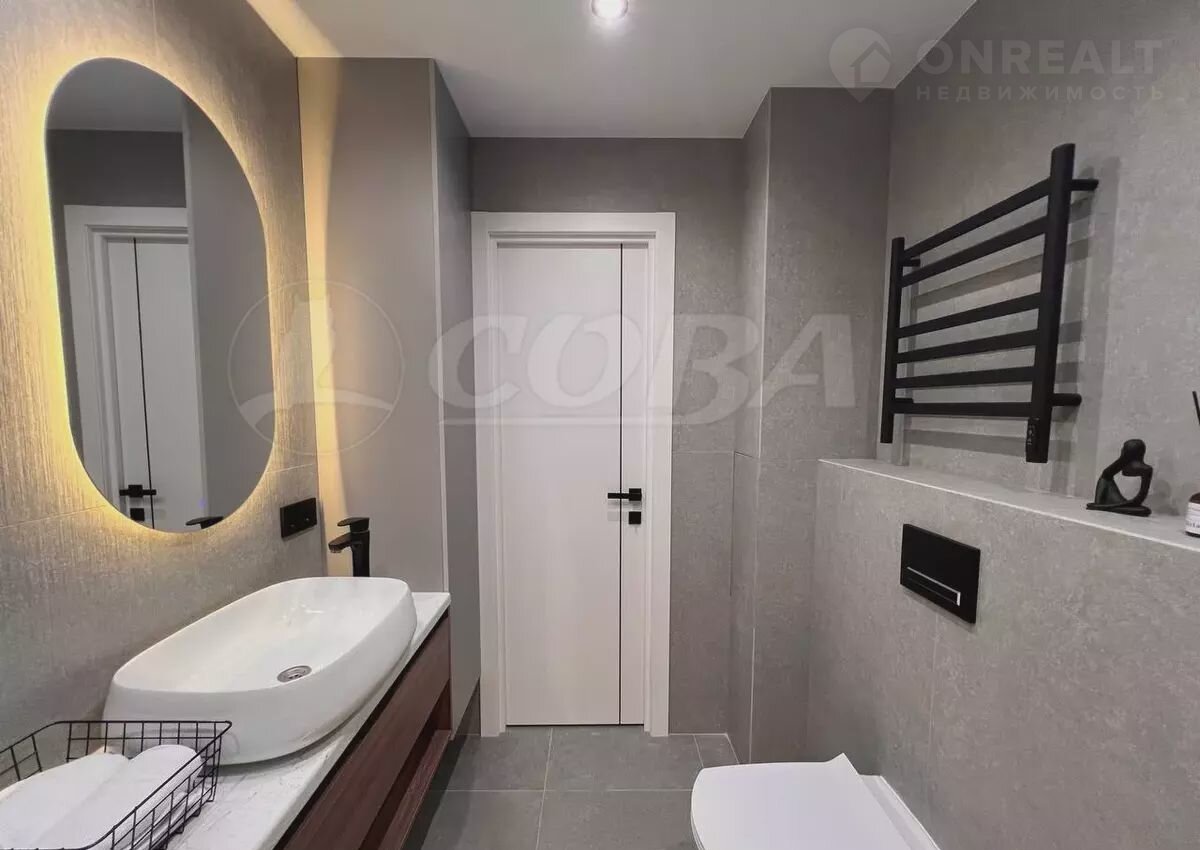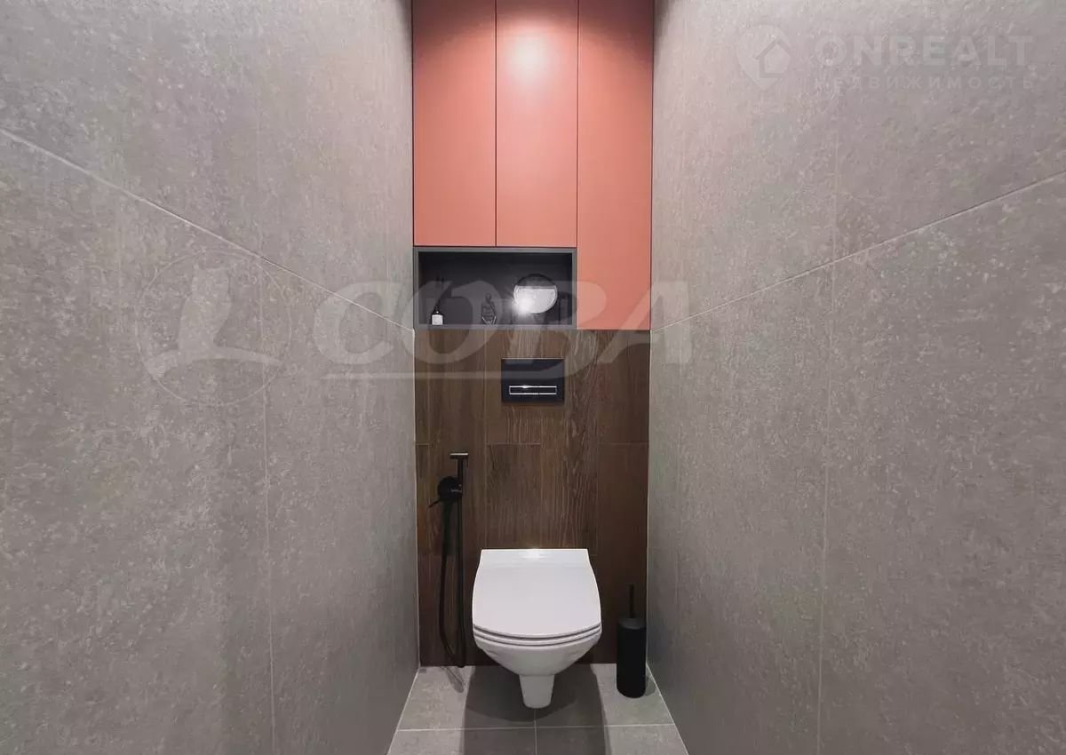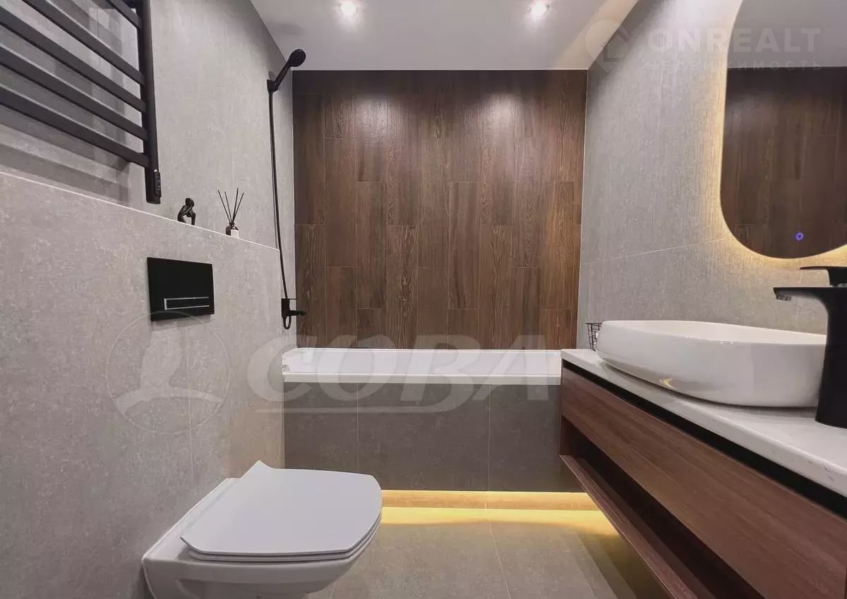 В ванной комнате установлена качественная ванна и инсталляция, полотенцесушитель, зеркало с подсветкой и тумбой. В туалетной комнате установлена ещё одна инсталляция, гигиенический душ и шкаф для бытовых нужд.