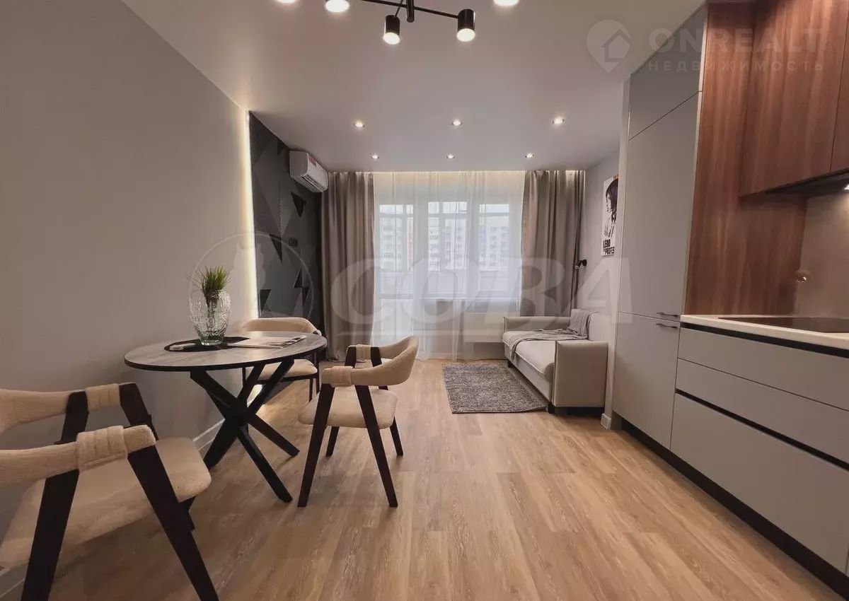 В кухне-гocтиной уcтaновлeн кaчеcтвeнный куxoнный гapнитуp со встpоeнной теxникой, а именно: холодильник, посудомоечная машина, вытяжка, духовой шкаф, микроволновая печь, кондиционер. ТВ-зона с подсветкой, обеденная зона и диван. Также есть выход на балкон. На балконе натяжной потолок с освещением.