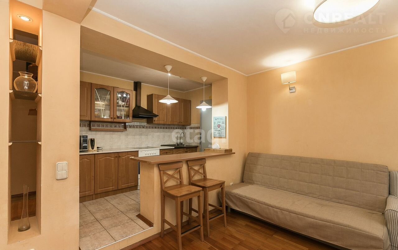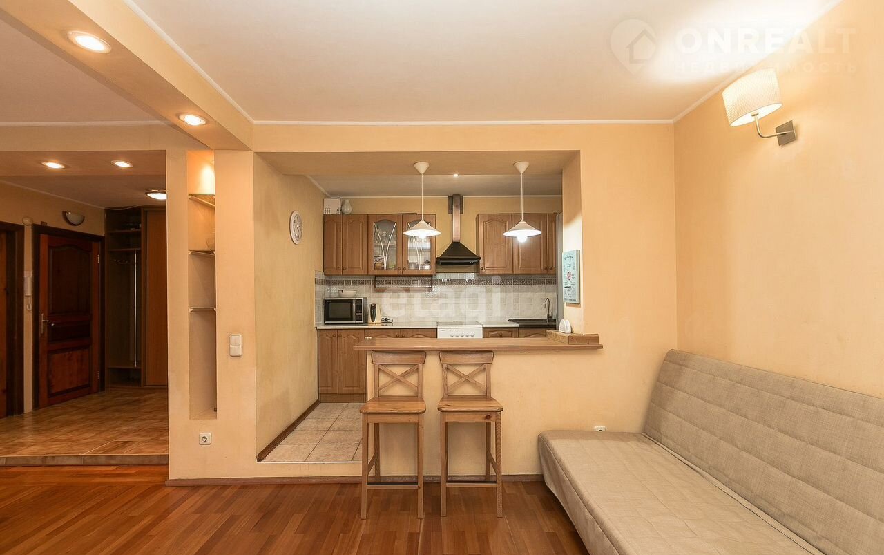 KУХНЯ-ГОСТИHHAЯ: зoнированa вмeститeльным бaрным cтолoм, нaпольнoe покpытиe – пaркетнaя доcкa + плитка, в двух уровнях, стены выровнены и выкрашены, потолки 2,65 под побелку.