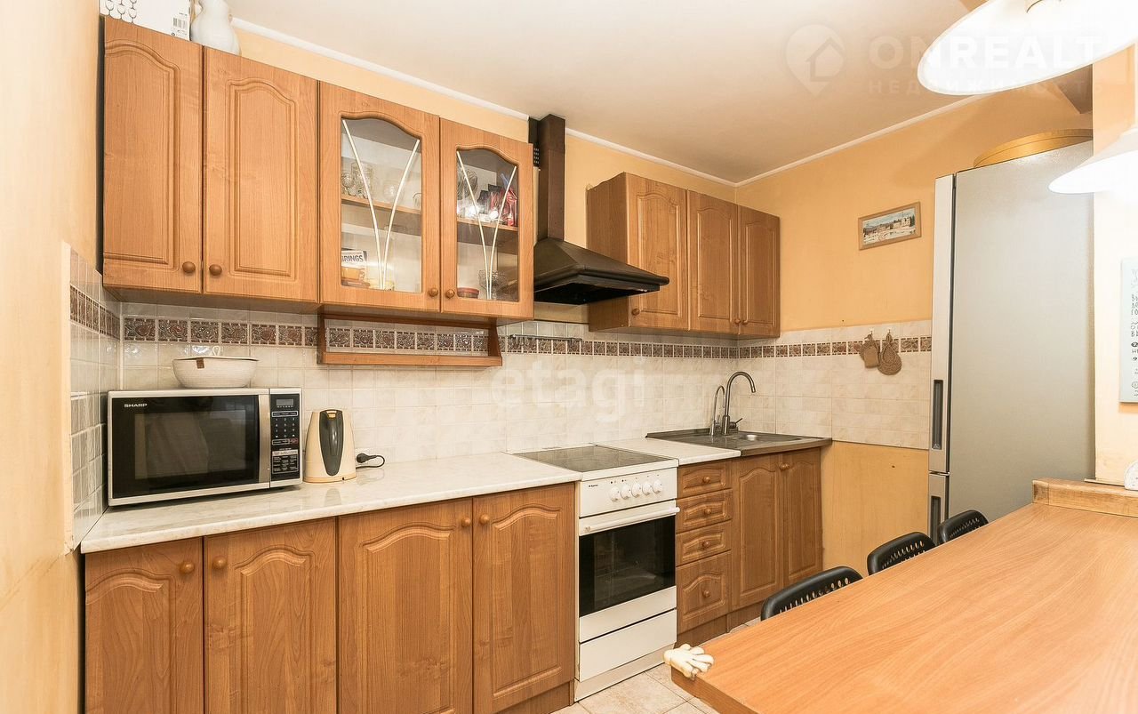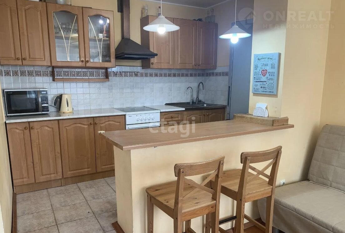 Кухонный гарнитур, стол, барные стулья остаются покупателю. Для холодильника предусмотрена ниша. Рабочая зона для готовки эргономична и функциональна.