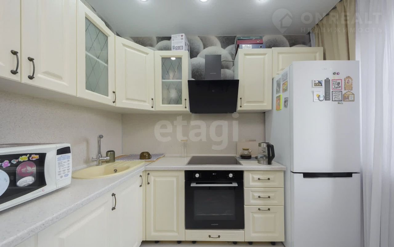 При продаже в квартире остается кухонный гарнитур, шкаф, тумба, бытовая техника, карнизы.