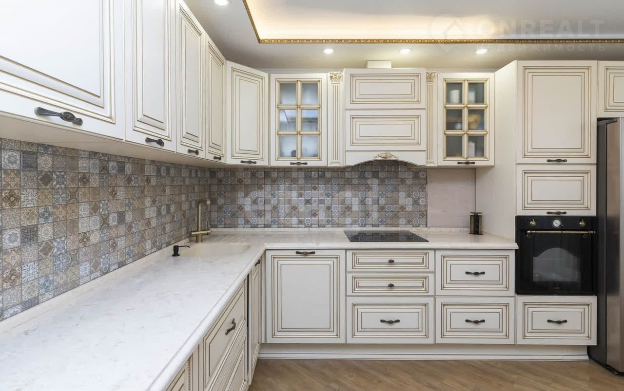 Кухонный гарнитур в классическом стиле – это воплощение мечты любой хозяйки. Фурнитура Вlum обеспечивает плавное и бесшумное открывание и закрывание, а встроенная техника Grаudе гарантирует безупречную работу. Посудомоечная машина Gоrеnjе шириной 60 см и вместительный холодильник Sаmsung дополняют кухонный ансамбль.