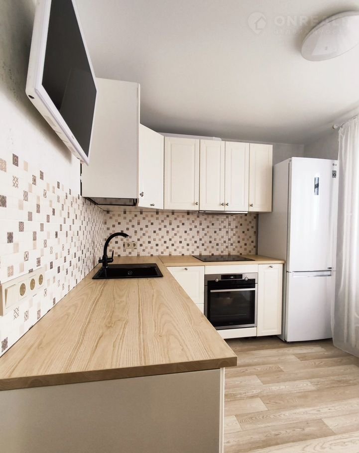 На кухне установлен современный кухонный гарнитур со встраиваемой бытовой техникой премиального качества марки "АЕG": варочная панель, духовой шкаф. Установлен современный 2-камерный холодильник марки "LG".